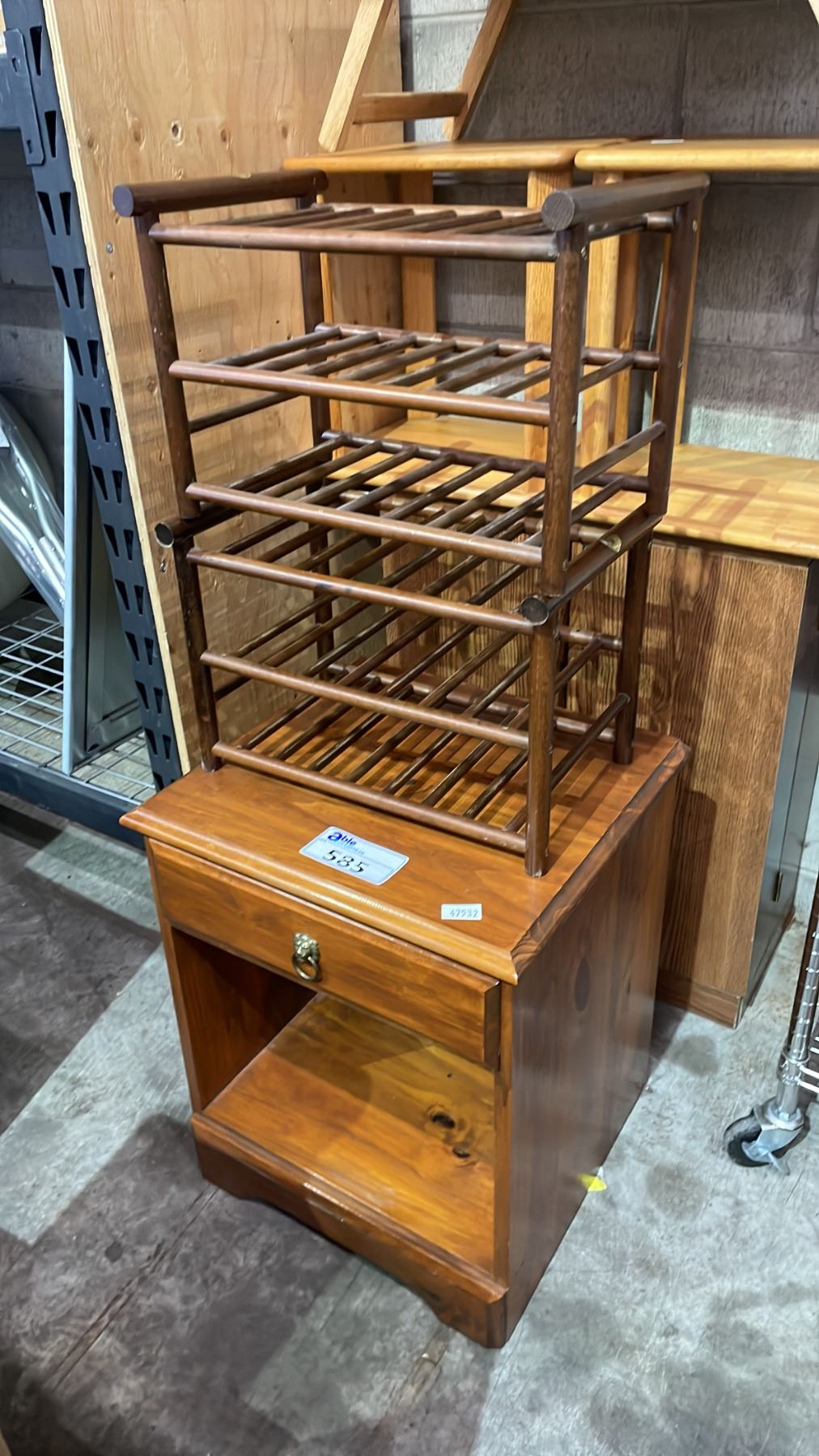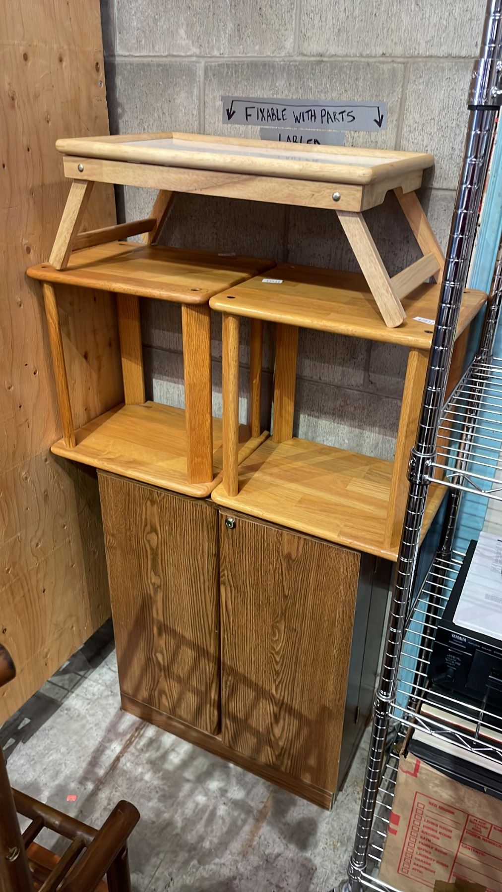ASSORTED WOODEN FURNITURE - SIDE TABLE, SMALL STORAGE CABINET, STOOLS & FOLDING LAP DESK