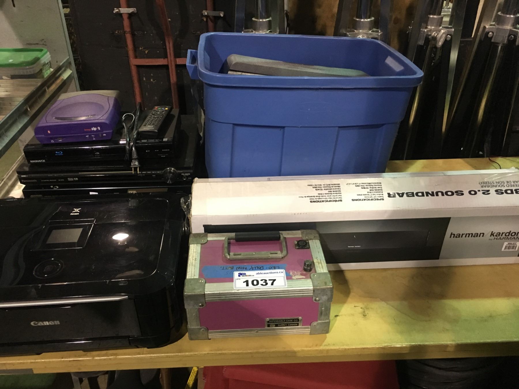 ASSORTMENT OF STEREO COMPONENTS, BLUE RAY PLAYER & CANON PRINTER HARMAN KARDON SOUNDBAR