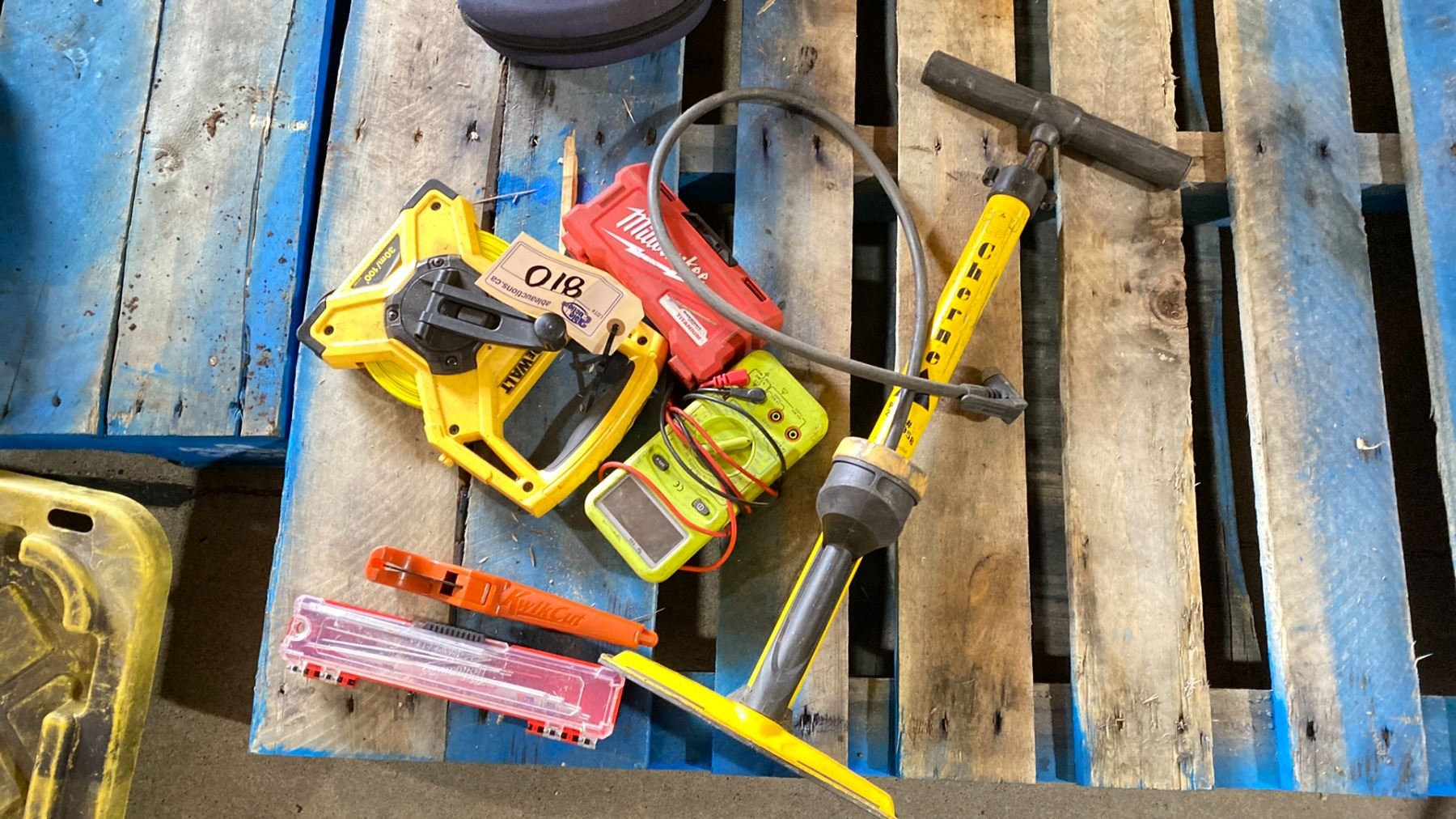 ASST GROUP OF TOOLS. 100' DEWALT TAPE, BIKE PUMP, MULTIMETER, SAW BLADES, PVC CUTTER