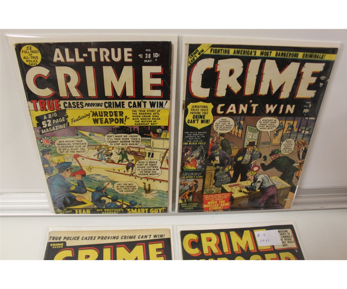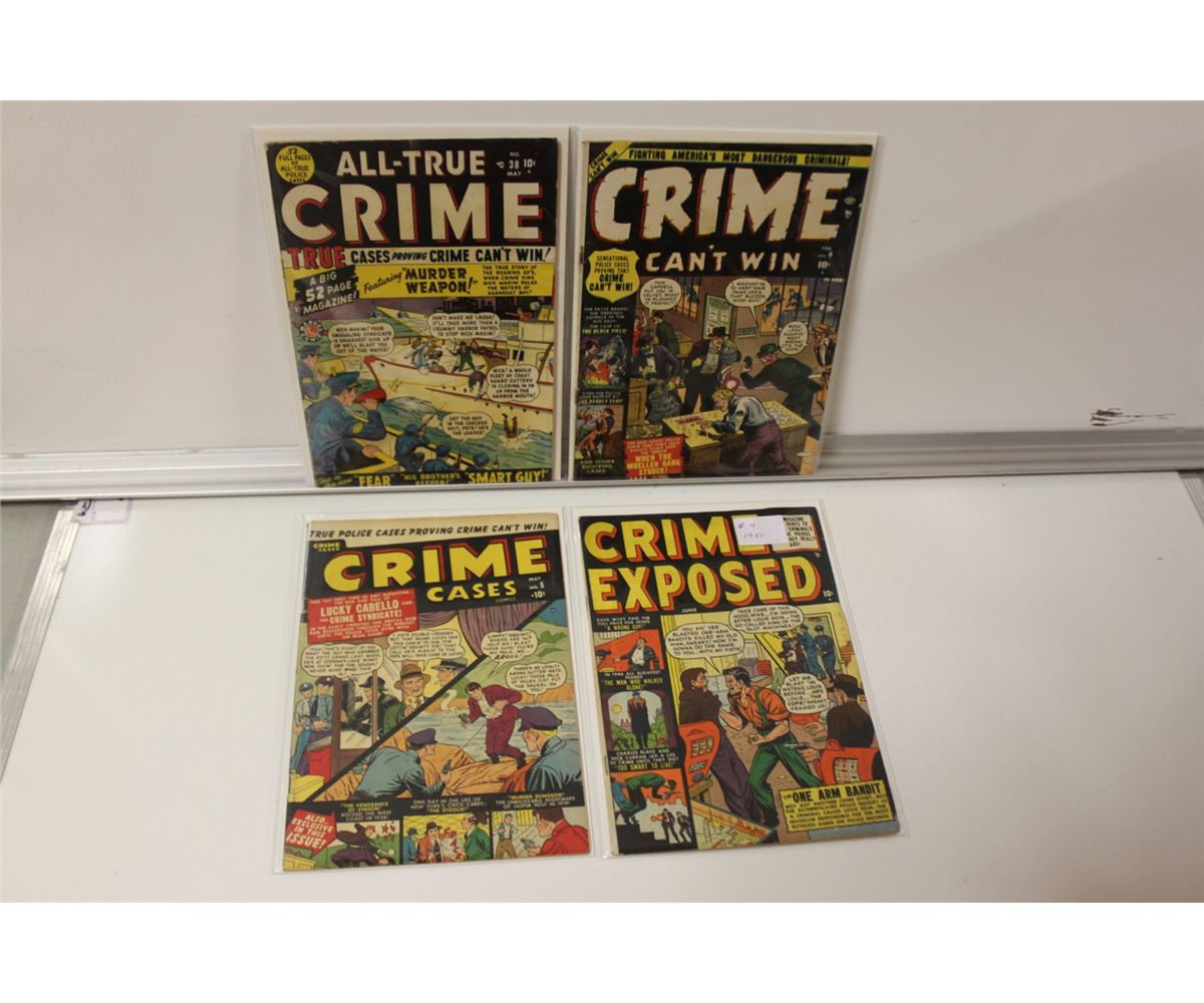 ATLAS 1950'S PRE-CODE CRIME LOT, 4 DIFFERENT TITLES. ALL-TRUE CRIME #38 (1950), CRIME CAN'T WIN #9 (1952) CRIME CASES #5 (1951), CRIME EXPOSED #4 (1951) LOWER MID TO MID GRADE, NICE & SOLID COPIES.