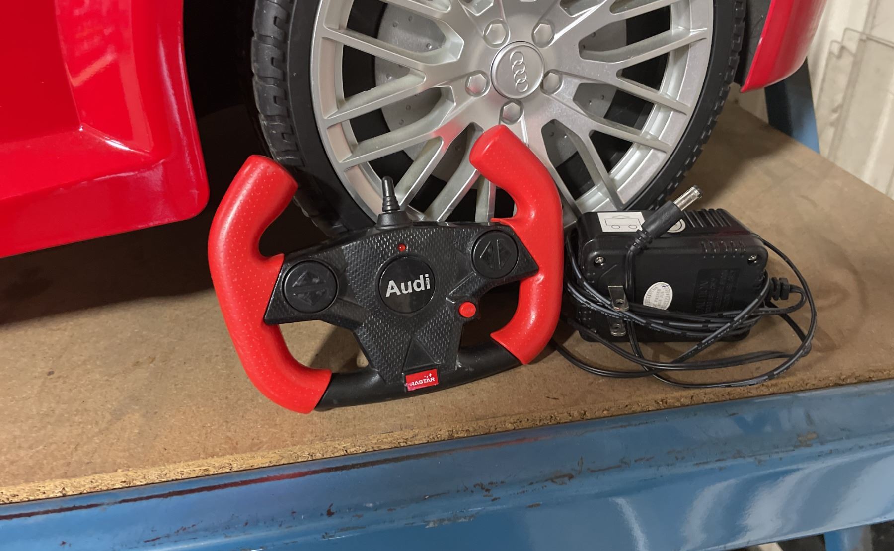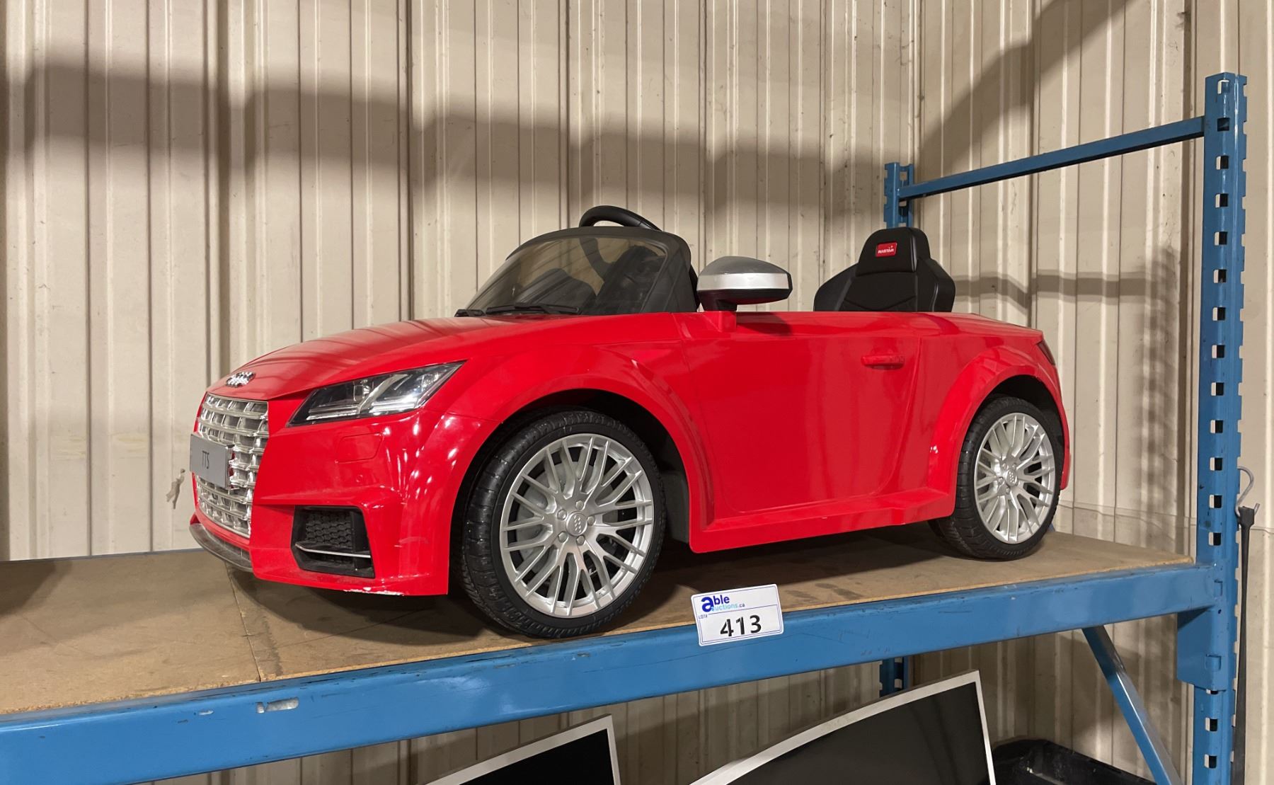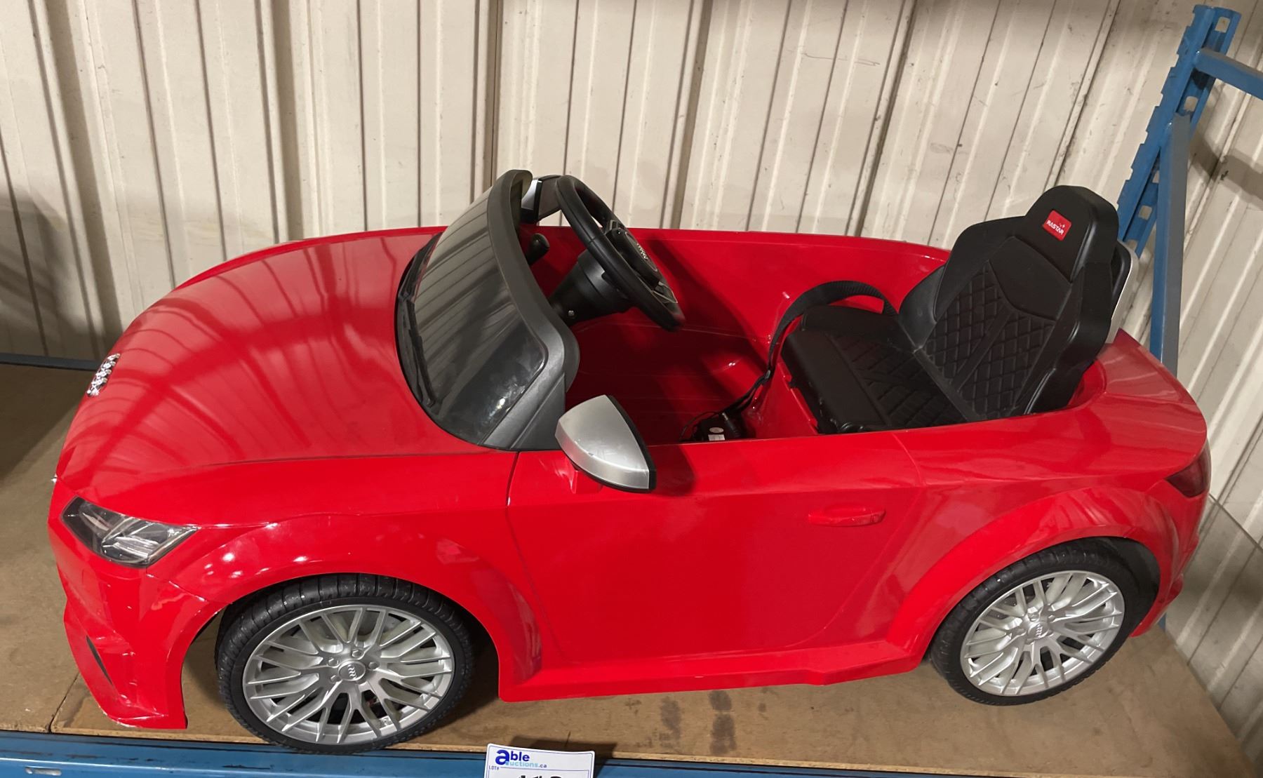 AUDI TTS RED ELECTRIC REMOTE CONTROLLED CHILDRENS RIDING VEHICLE WITH POWER ADAPTER & REMOTE CONTROL *RUNS, NEEDS NEW BATTERY, WILL NOT HOLD FULL CHARGE*