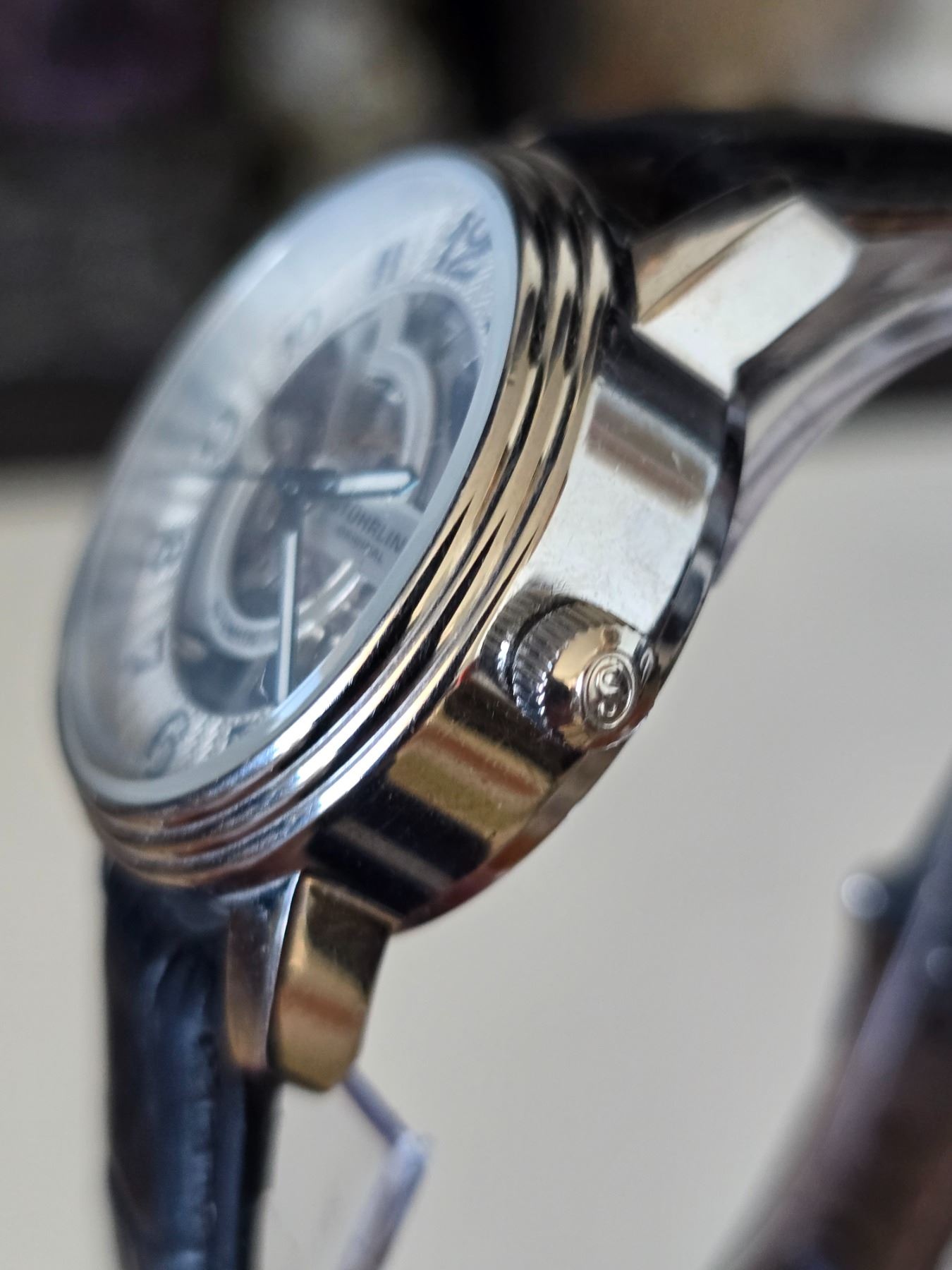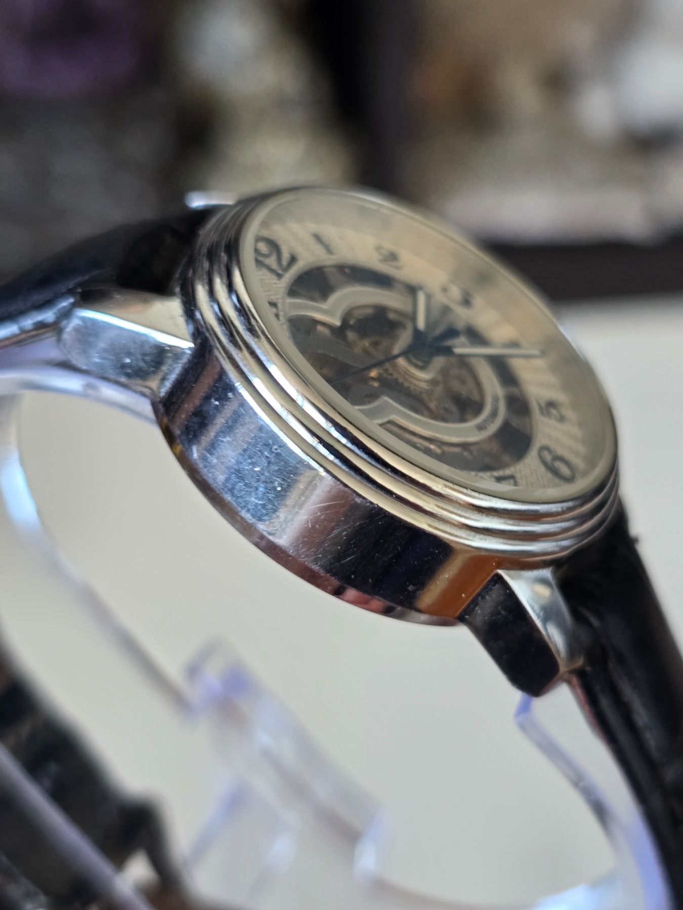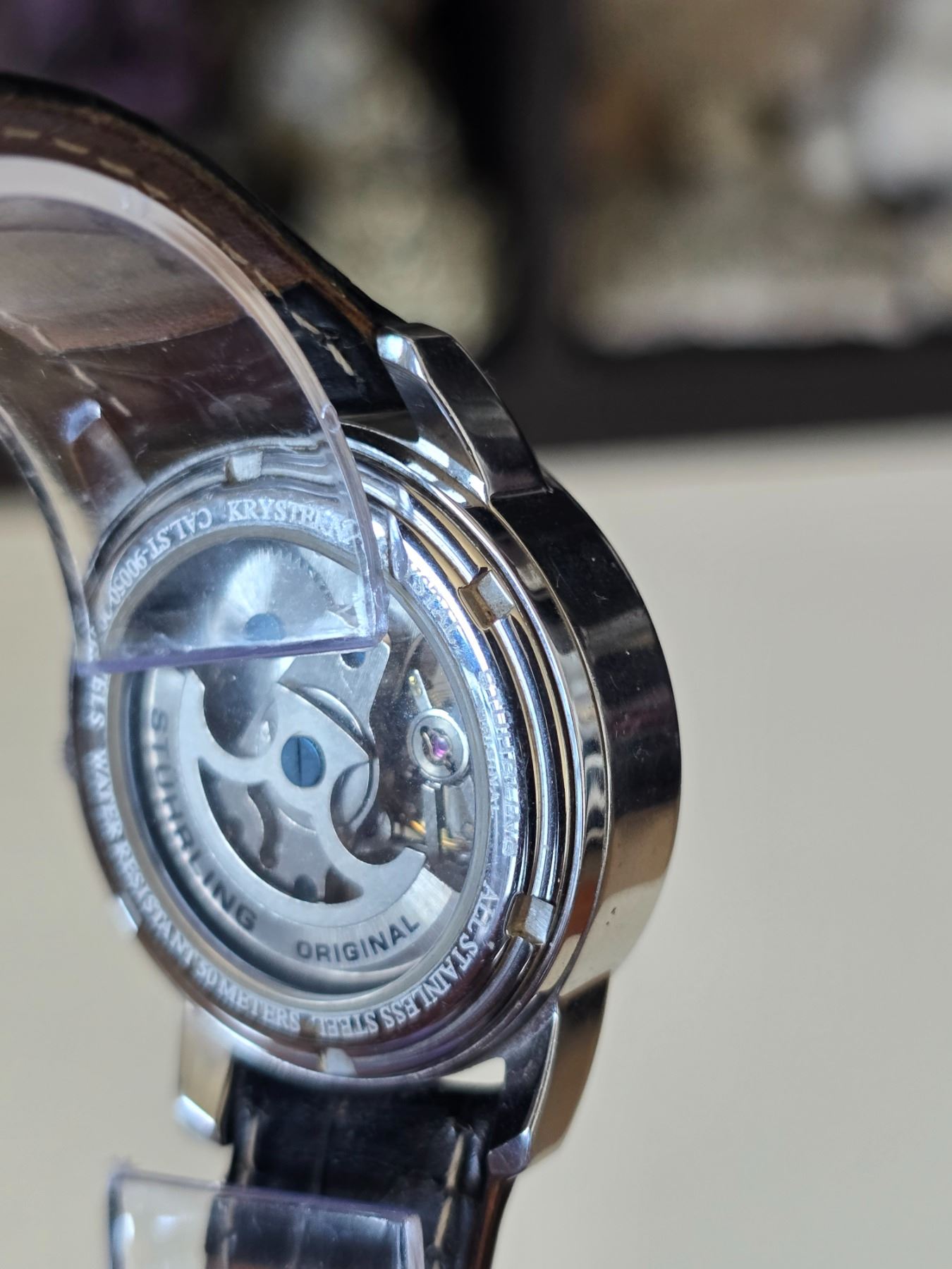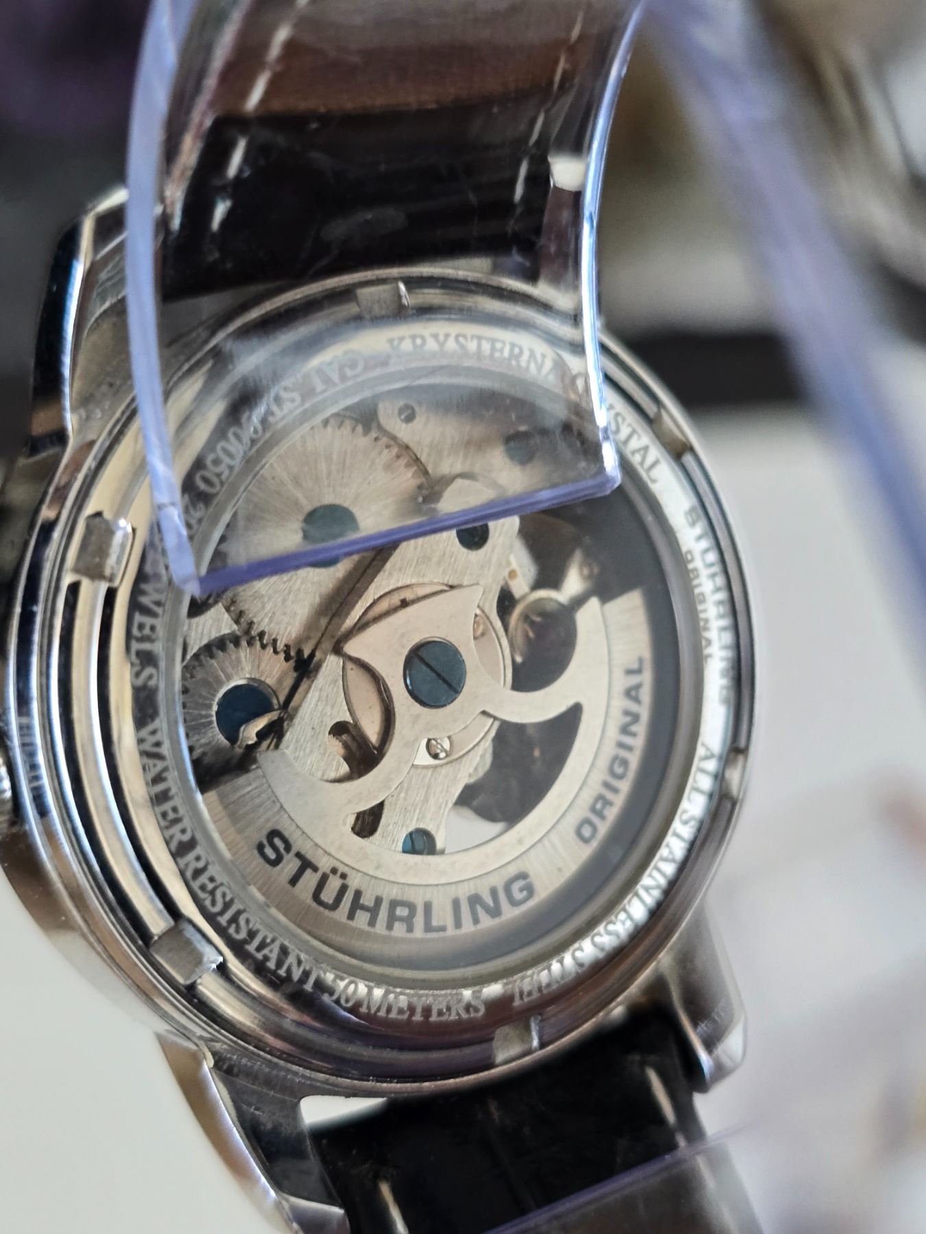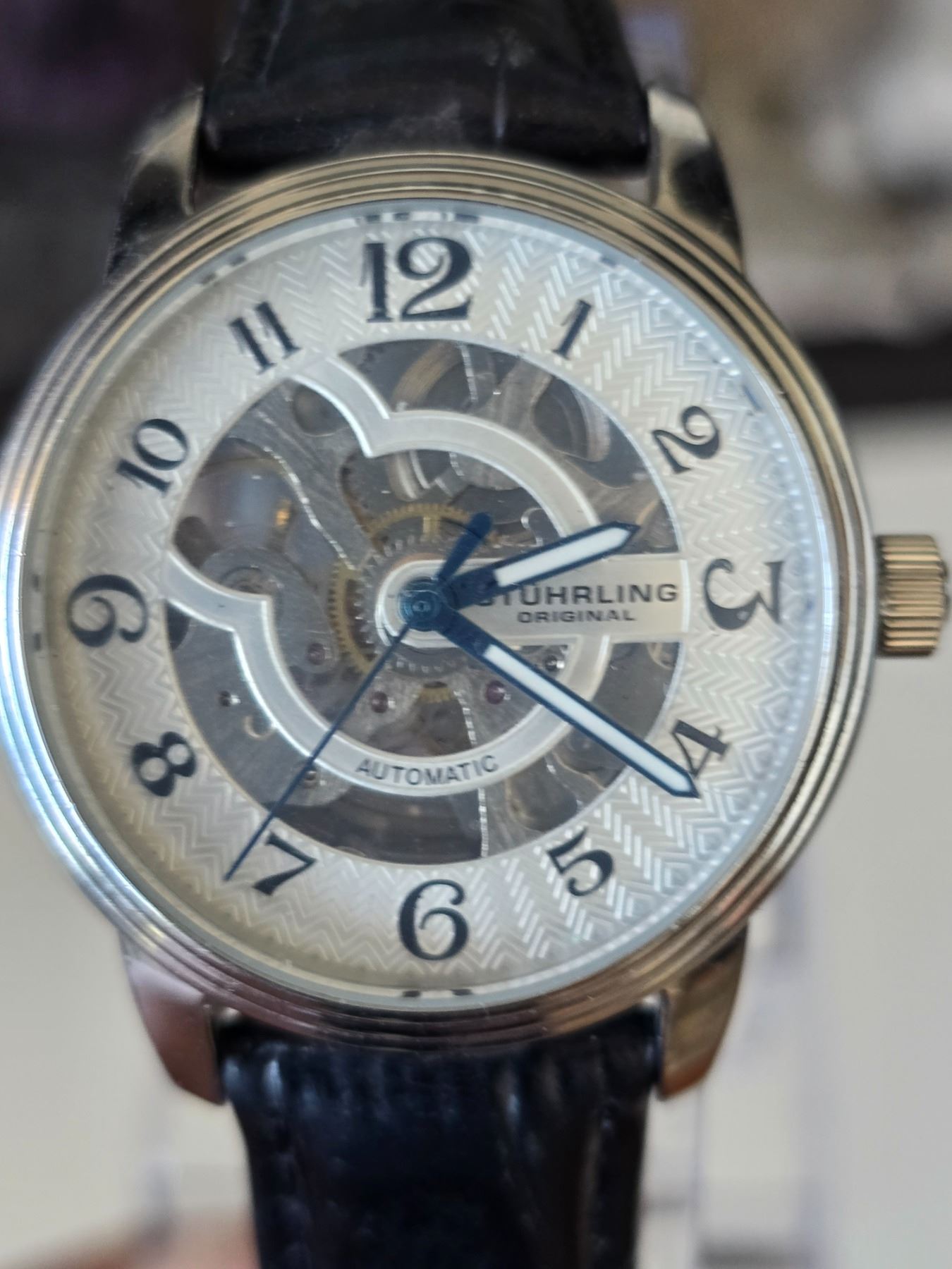 AUTHENTIC SOPHISTICATED STUHRING 730.01 ORIGINAL DELPHI ORACLE AUTOMATIC SKELETON WATCH REFERENCE # 107BG.33152, CALIBRE ST 900-50, 44 MM STAINLESS STEEL CASE ALLIGATOR EMBOSSED GENUINE LEATHER STRAP
