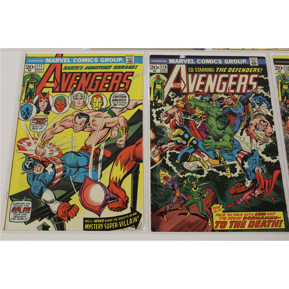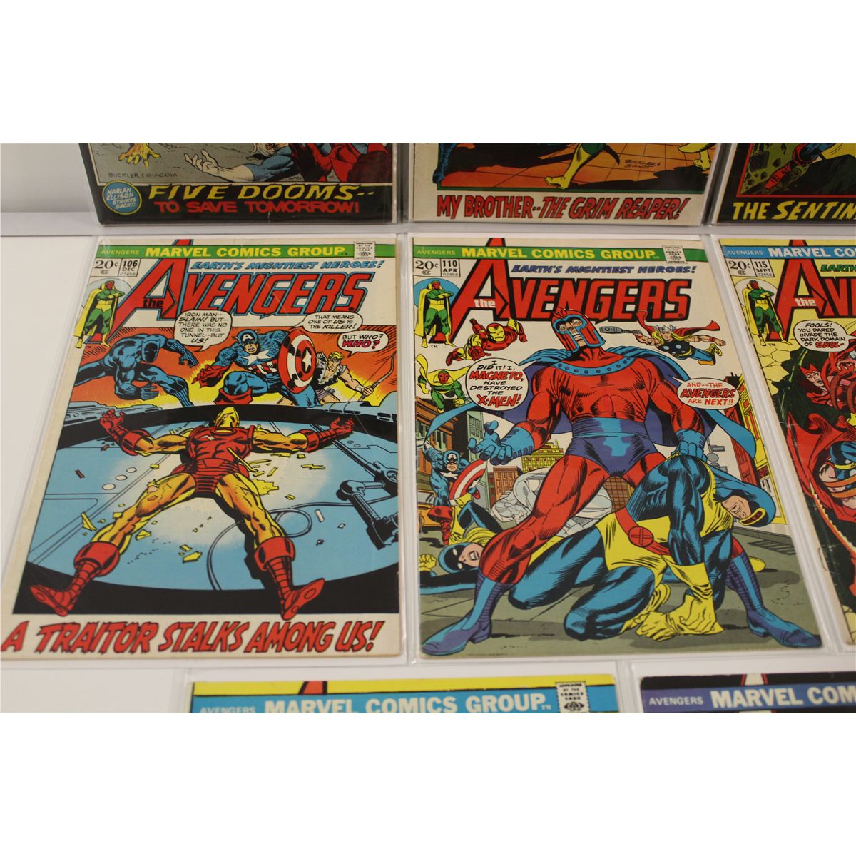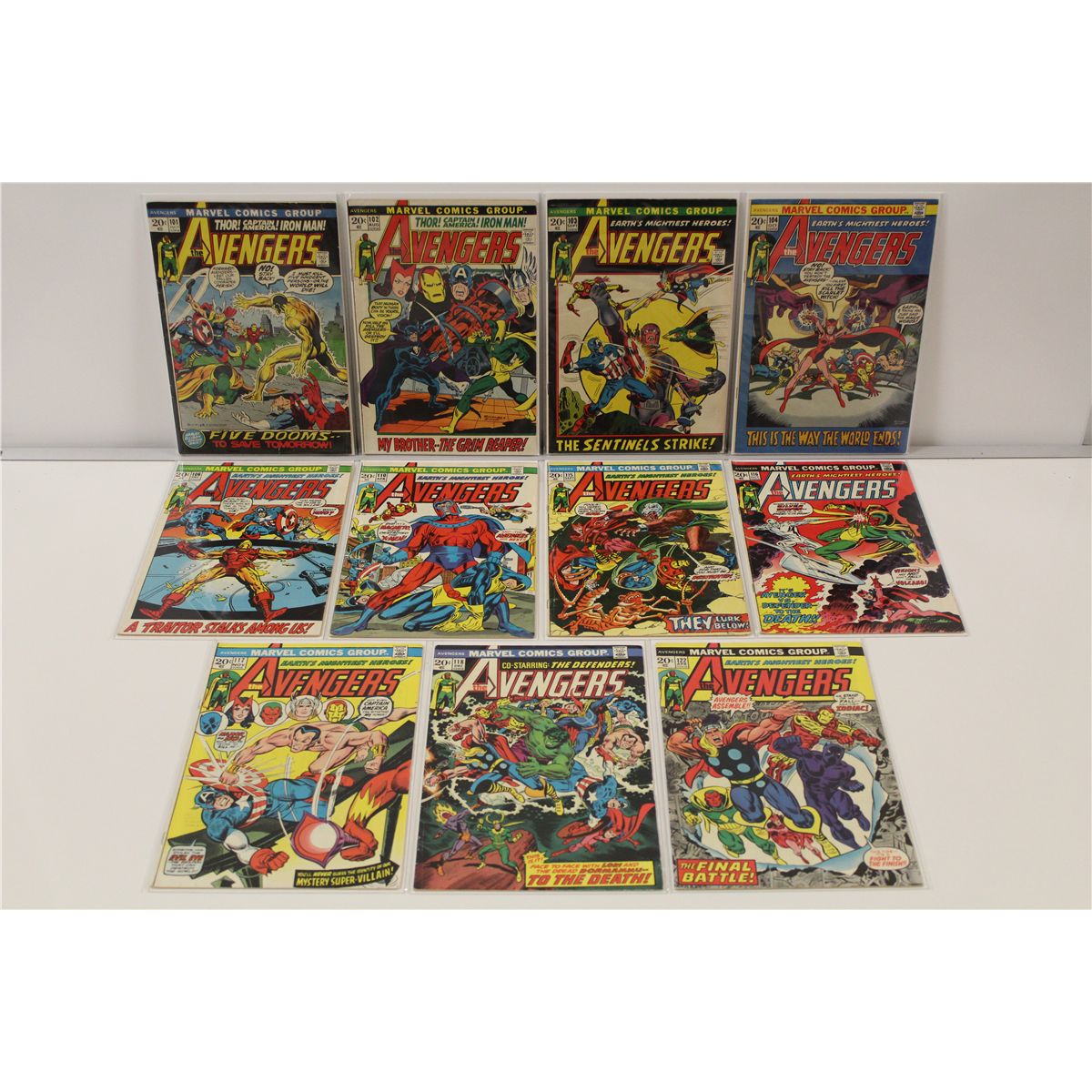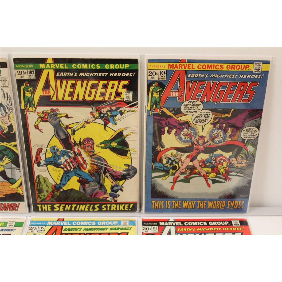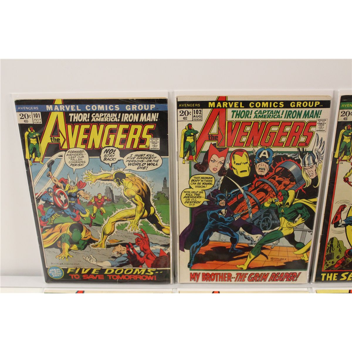 AVENGERS #101-122 (1972-74) EARLY BRONZE RUN OF 11 ALL 20 CENT COVER ISSUES! INCLUDES #101-104, 106 , 110 - X-MEN X-OVER, 115-118 - DEFENDER X-OVER & 122. SHARP MID TO HIGHER MID GRADE AVERAGE, GLOSSY, TIGHT & SUPPLE, VERY NICE BOOKS! 2013 OVERSTREET TOP END GUIDE VALUE OF $600