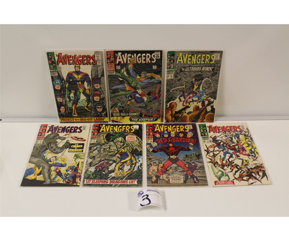 AVENGERS (1966-67) #30-44, 7 BOOKS TOTAL. EARLY NUMBERS IN LOWER MID GRADE AVERAGE