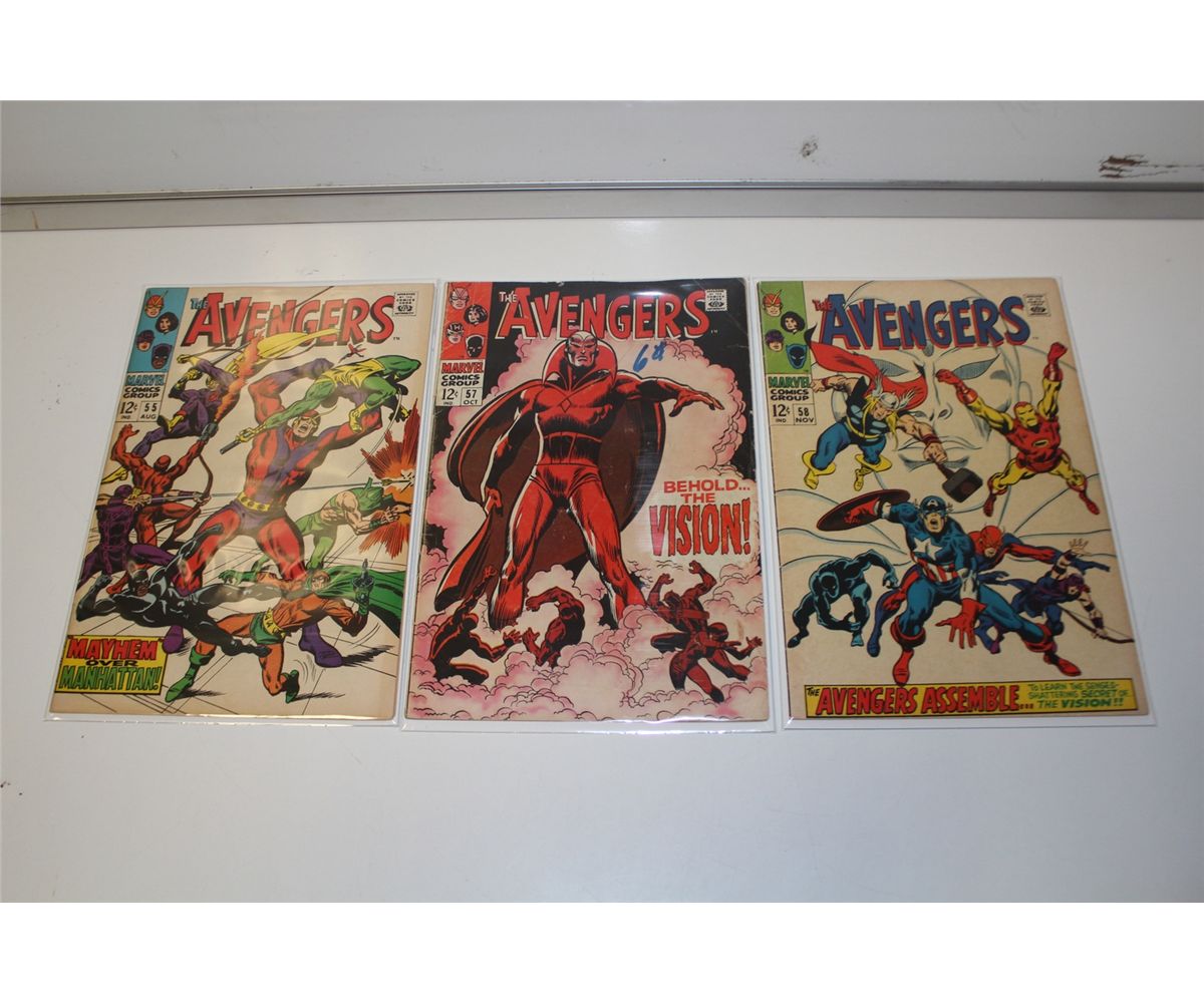 AVENGERS #55, 57 & 58 (1968) 3 KEY ISSUES. #55- 1ST APP. ULTRON, #57- 1ST APP. VISION, #58- ORIGINVISION. #55- SOLID MID GRADE, #57- LOW MID GRADE, #58- SHARP MID TO HIGHER MID. GLOSSY, TIGHT AND SUPPLE, A NICE LOT OF KEYS!