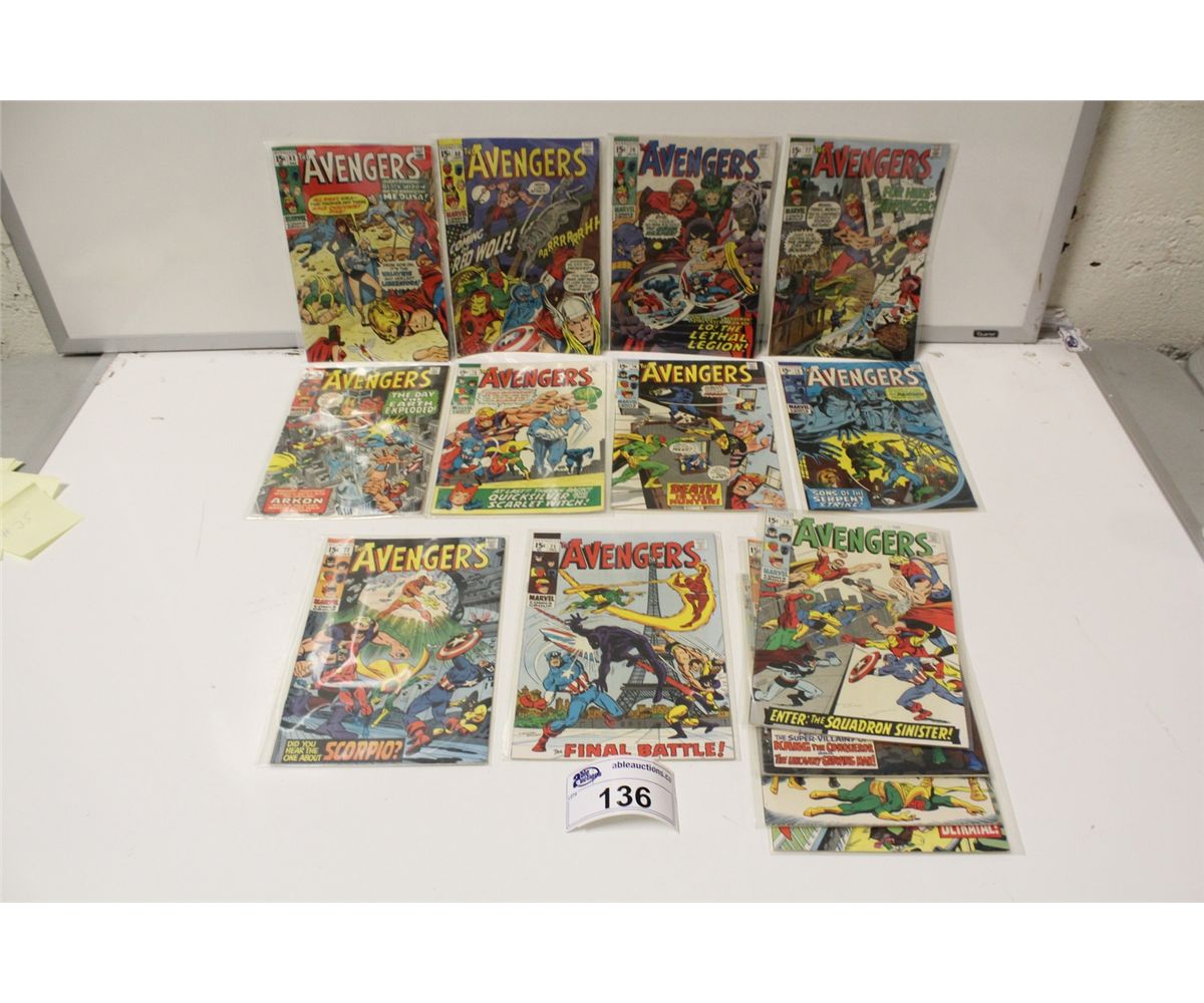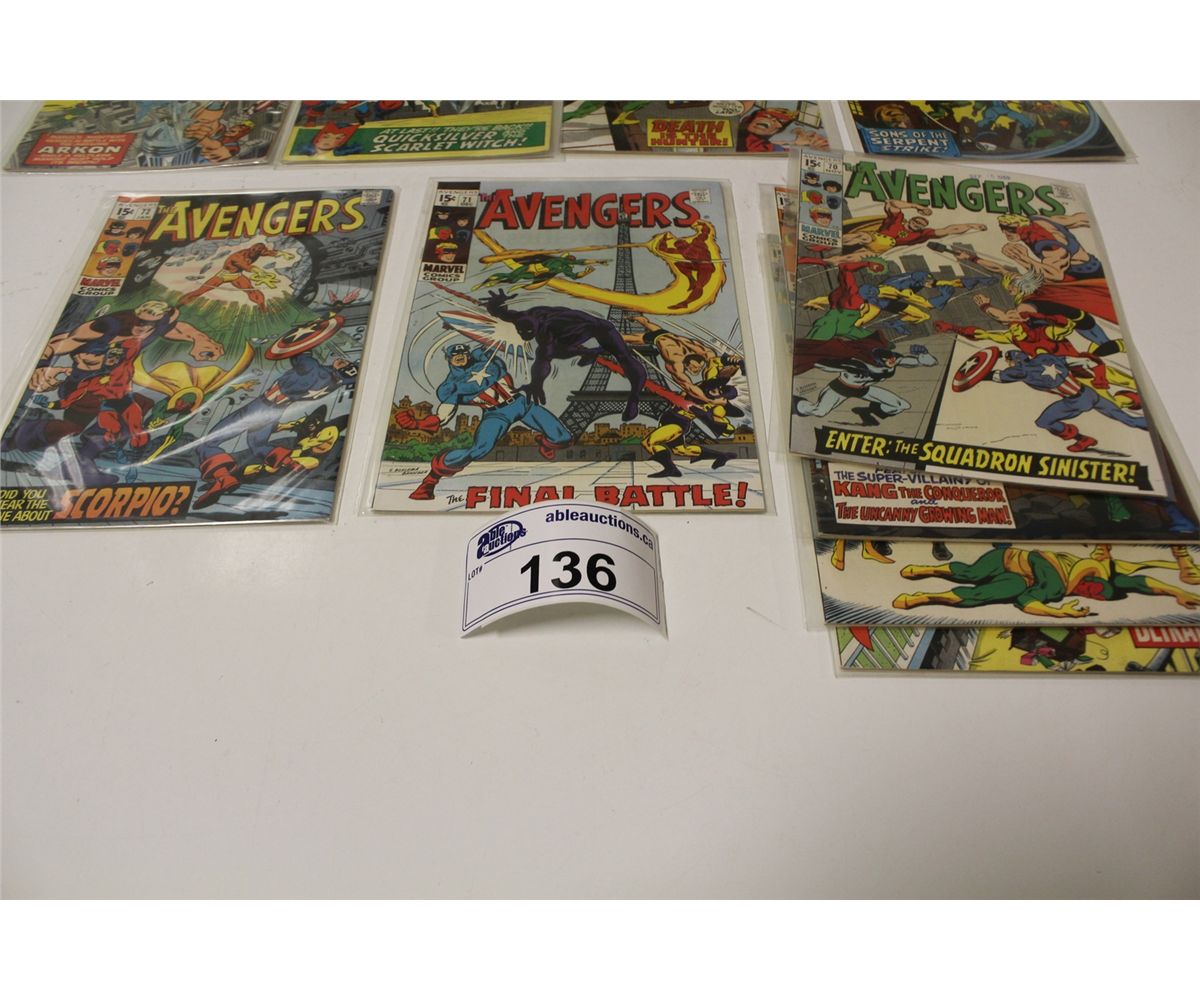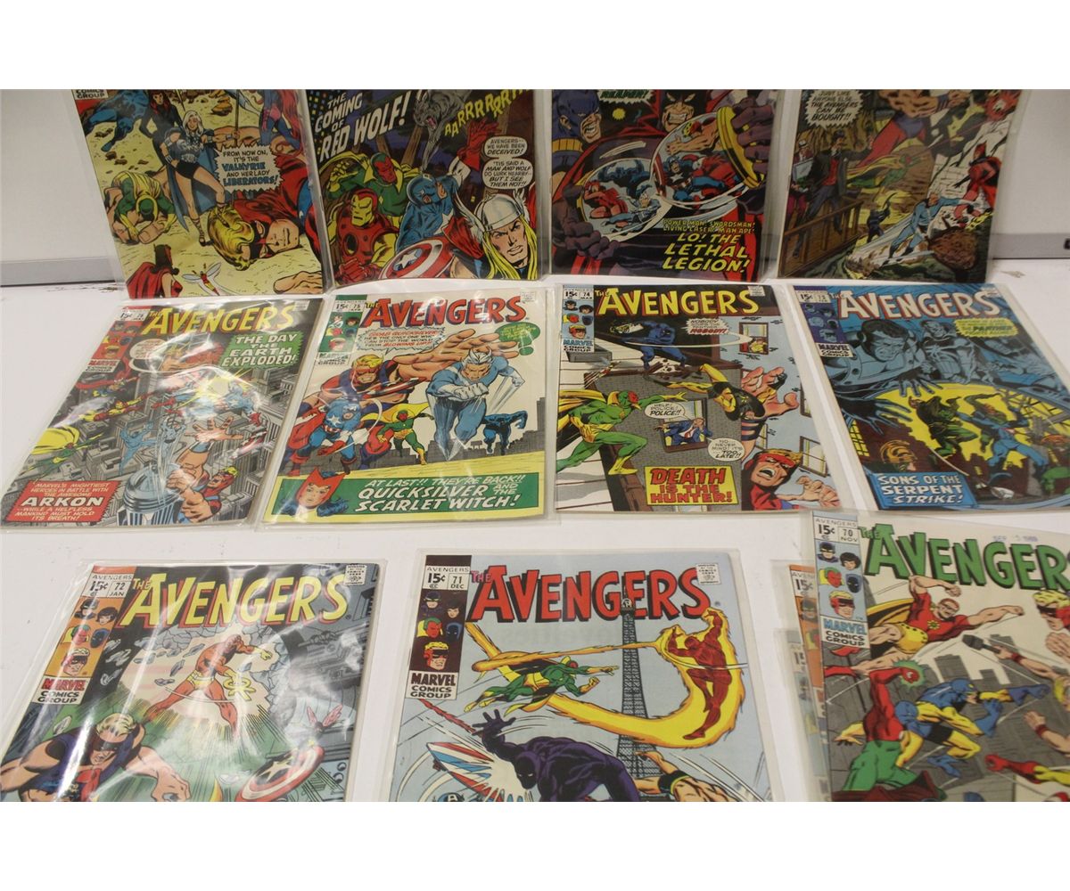 AVENGERS #66,68-77, 78-80 & 83 (1969-70) 14 ISSUE SILVER/EARLY BRONZE RUN! #71 - 1ST APP. THE INVADERS. 9 ISSUES HAVE EXTRA STAPLE HOLES AT SPINE. MID TO HIGH MID GRADE AVG, GLOSSY, TIGHT & SUPPLE.