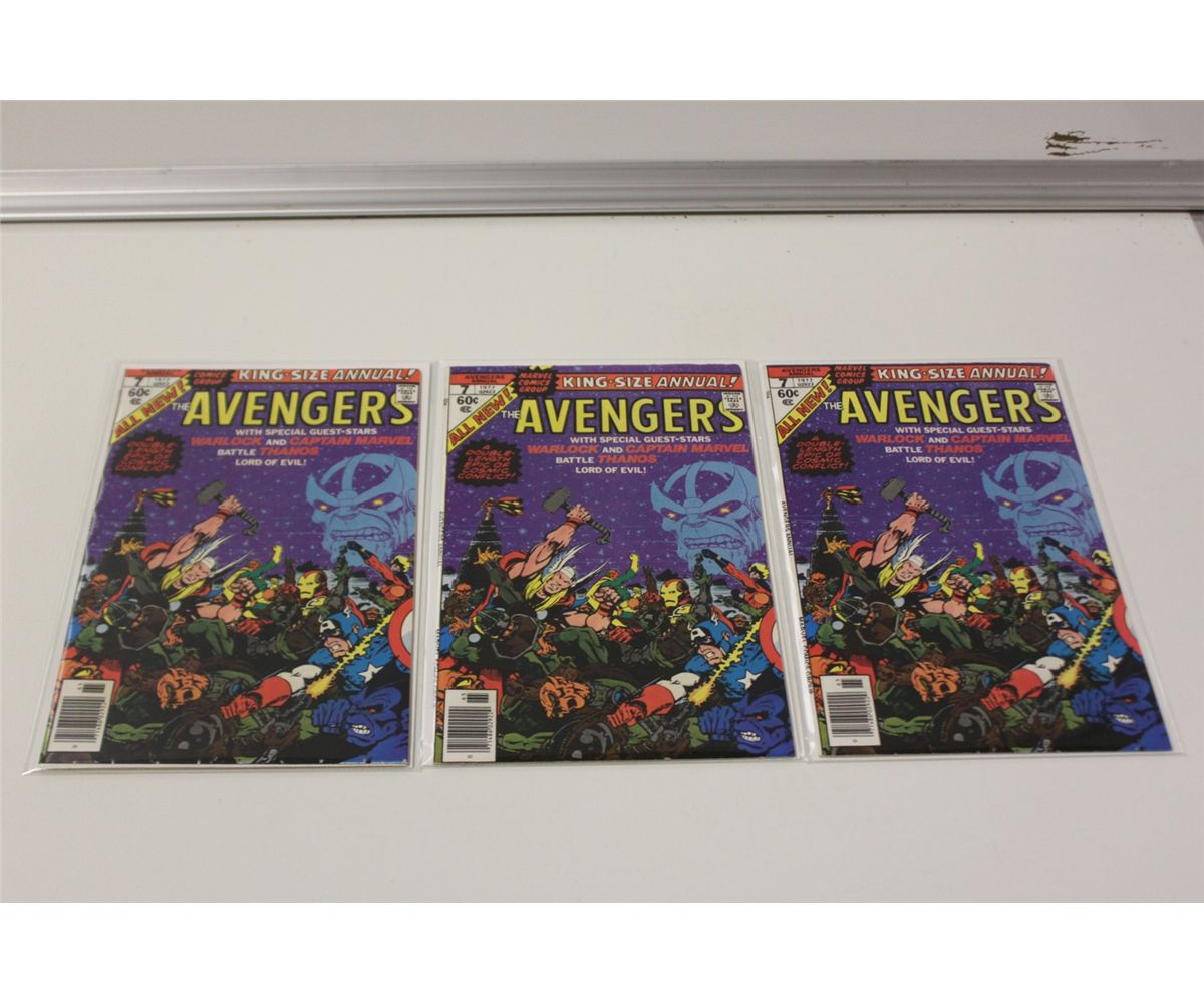 AVENGERS ANNUAL #7 X 3 HIGHGRADE COPIES. KEY BOOK: WARLOCK DIES, JIM STARLINS THANOS SAGA. VERY SHARP, EXCELLENT COPIES.