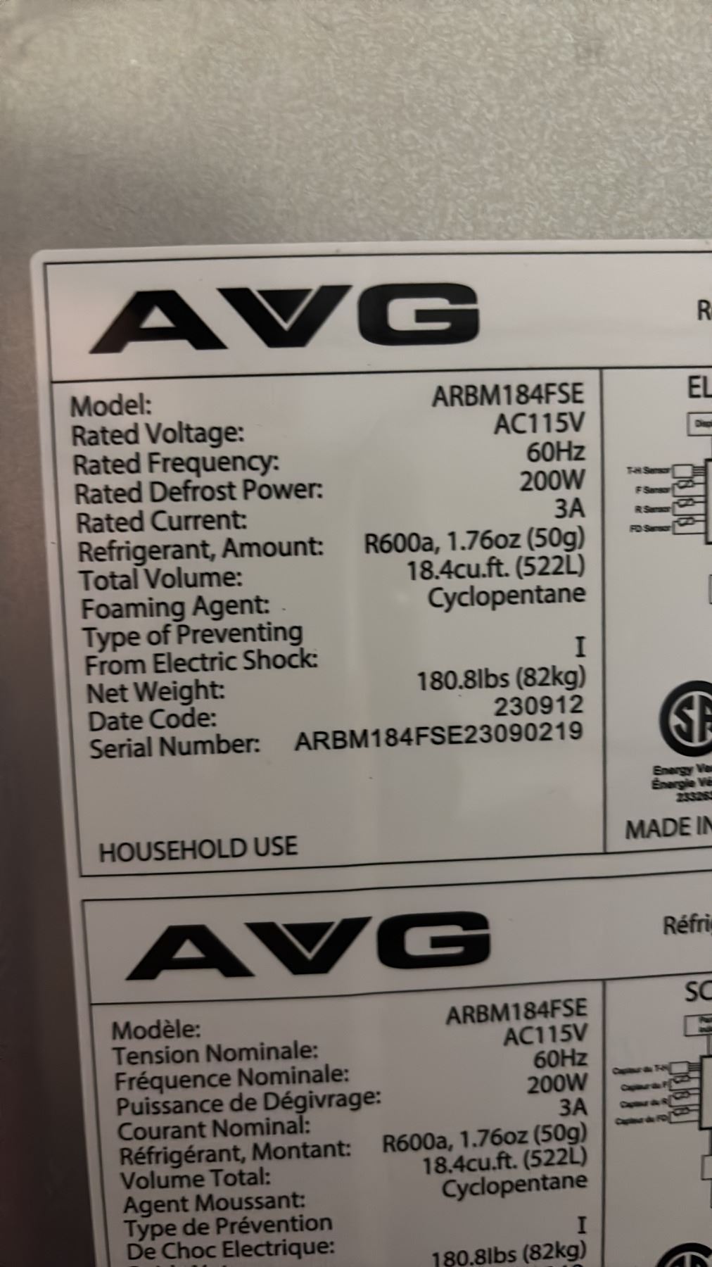 AVG STAINLESS STEEL FRENCH DOOR FRIDGE WITH ROLLOUT FREEZER 29.5"W