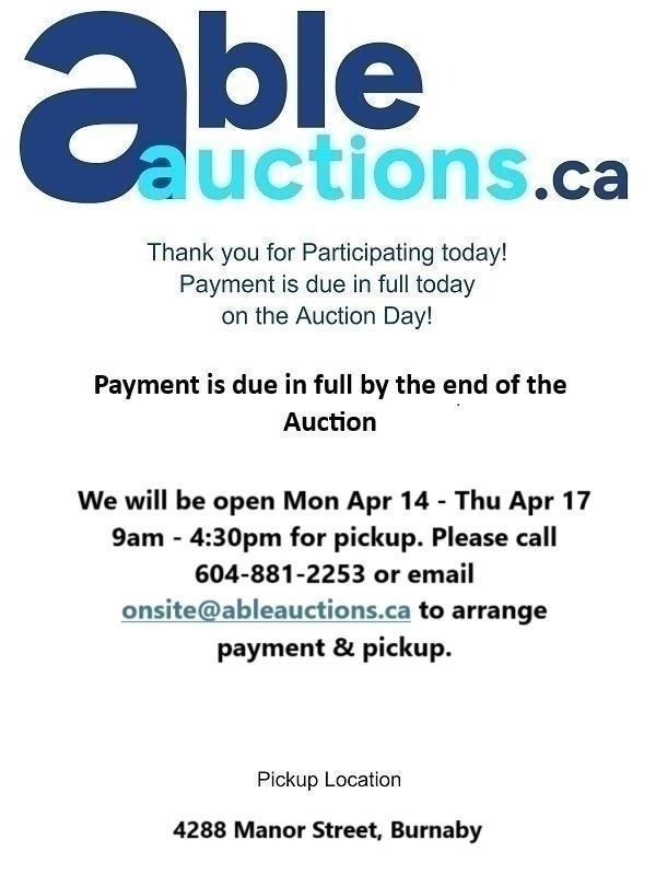 We will be open Mon Apr 14 - Thu Apr 17 9am - 4:30pm for pickup. Please call 604-881-2253 or email onsite@ableauctions.ca to arrange payment & pickup.