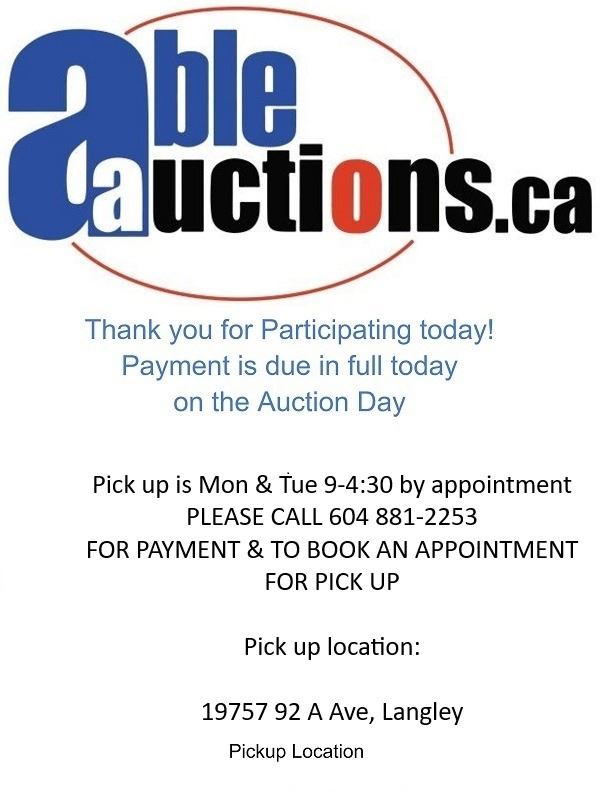 Payment is due in full today. You can authorize us via email or calling 604-881-2253 we can directly charge your Visa or MC on file for any purchases under $999. *Please note we will need to have a verbal confirmation of the last 4 digits of your credit card to process the payment* For e-transfers please email them to payment@ableauctions.ca Payment is online only. Payments for invoices over $999.00 we will need to have an e transfer, wire or direct deposit. Please call to book an appointment for pickup. *Please make sure you are able to make your scheduled pick up time.