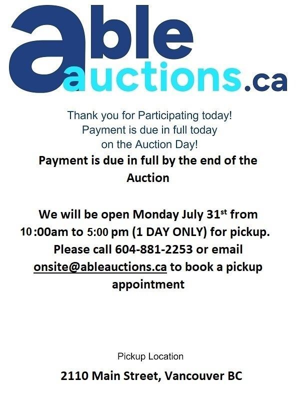 Payment is due in full today. if you authorize us by calling 604-881-2253 we can directly charge your Visa or MC on file (only applies to purchases under $999). *Please note we will need to have a verbal confirmation of the last 4 digits of your credit card to process the payment* For e-transfers please email them to payment@ableauctions.ca Payment is Online only. Pickup is by appointment please call to book a time slot.
