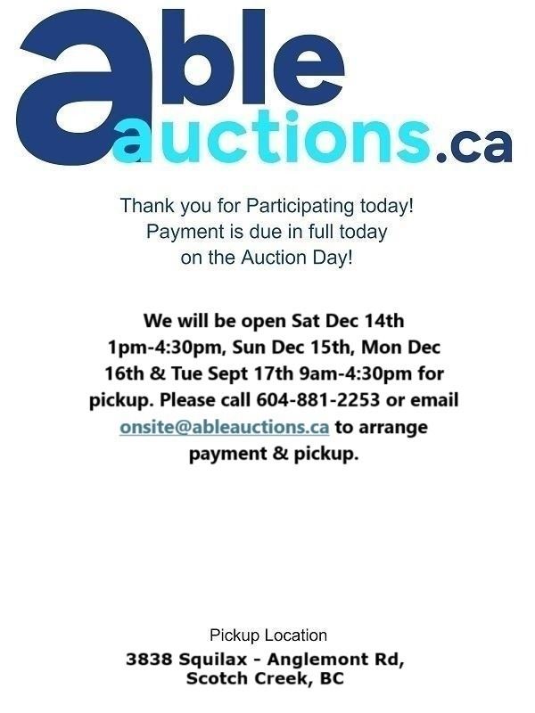 We will be open Sat Dec 14th 1pm-4:30pm, Sun Dec 15th, Mon Dec 16th & Tue Sept 17th 9am-4:30pm for pickup. Please call 604-881-2253 or email onsite@ableauctions.ca to arrange payment & pickup