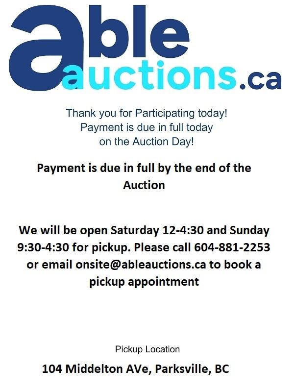 Payment is due in full today. if you authorize us by calling 604-881-2253 we can directly charge your Visa or MC on file (only applies to purchases under $999). *Please note we will need to have a verbal confirmation of the last 4 digits of your credit card to process the payment* For e-transfers please email them to payment@ableauctions.ca Payment is Online only. Pickup is by appointment please call to book a time slot.