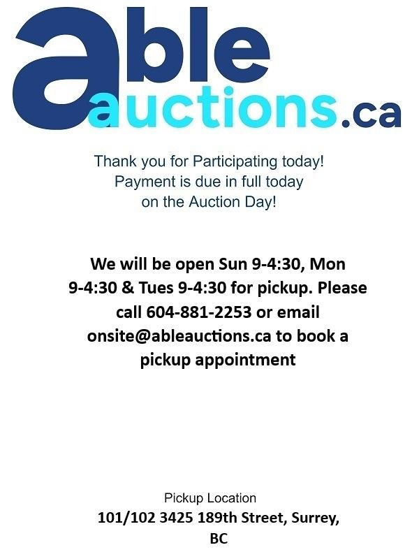 Payment is due in full today. You can authorize us by calling 604-881-2253 we can directly charge your Visa or MC on file for invoices under $999. *Please note we will need to have a verbal confirmation of the last 4 digits of your credit card to process the payment* For invoices over $999 please send e-transfers to payment@ableauctions.ca . We ask you call to book a time slot for pick up.