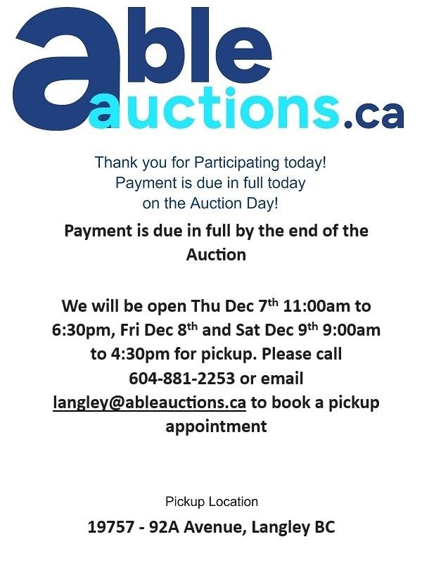 Payment is due in full today. You can authorize us by calling 604-881-2253 we can directly charge your Visa or MC on file for invoices under $999. *Please note we will need to have a verbal confirmation of the last 4 digits of your credit card to process the payment* For invoices over $999 please send e-transfers to payment@ableauctions.ca . We ask you call to book a time slot for pick up.