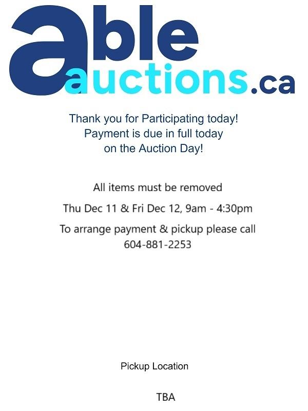 Payment is due in full today. You can authorize us by calling 604-881-2253 we can directly charge your Visa or MC on file for invoices under $999. *Please note we will need to have a verbal confirmation of the last 4 digits of your credit card to process the payment* For invoices over $999 please send e-transfers to payment@ableauctions.ca . We ask you call to book a time slot for pick up.