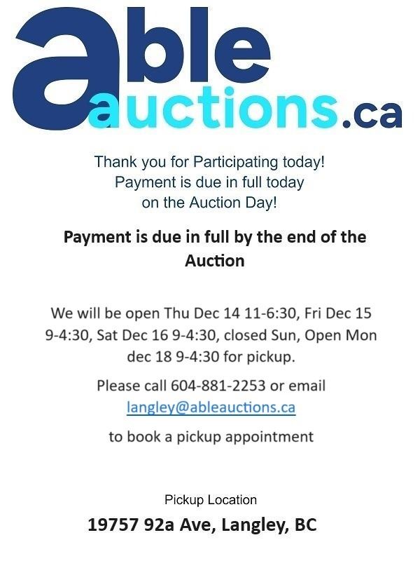Payment is due in full today. You can authorize us by calling 604-881-2253 we can directly charge your Visa or MC on file for invoices under $999. *Please note we will need to have a verbal confirmation of the last 4 digits of your credit card to process the payment* For invoices over $999 please send e-transfers to payment@ableauctions.ca . We ask you call to book a time slot for pick up.