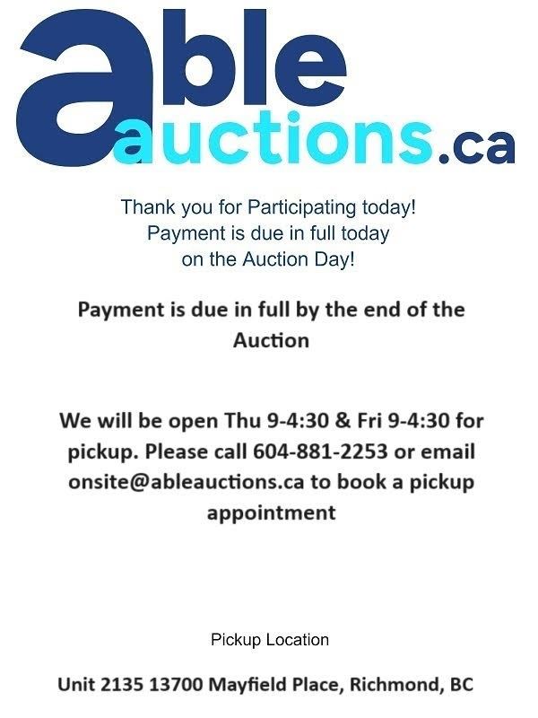 Payment is due in full today. if you authorize us by calling 604-881-2253 we can directly charge your Visa or MC on file (only applies to purchases under $999). *Please note we will need to have a verbal confirmation of the last 4 digits of your credit card to process the payment* For e-transfers please email them to payment@ableauctions.ca Payment is Online only. Pickup is by appointment please call to book a time slot.