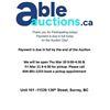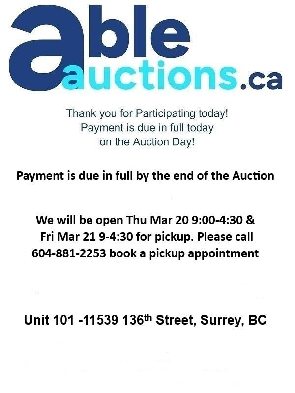 Payment is due in full today. You can authorize us via email or calling 604-325-2253 we can directly charge your Visa or MC on file for any purchases under $999. *Please note we will need to have a verbal confirmation of the last 4 digits of your credit card to process the payment* For e-transfers please email them to payment@ableauctions.ca Payment is online only. Payments for invoices over $999.00 we will need to have an e transfer, wire or direct deposit. Please call to book an appointment for pickup. *Please make sure you are able to make your scheduled pick up time.