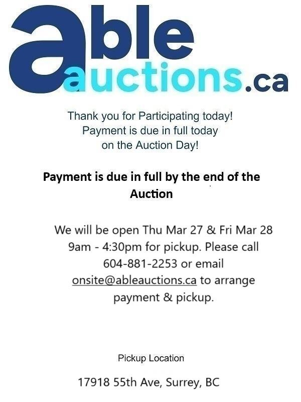 We will be open Thu Mar 27 & Fri Mar 28 9am - 4:30pm for pickup. Please call 604-881-2253 or email onsite@ableauctions.ca to arrange payment & pickup.