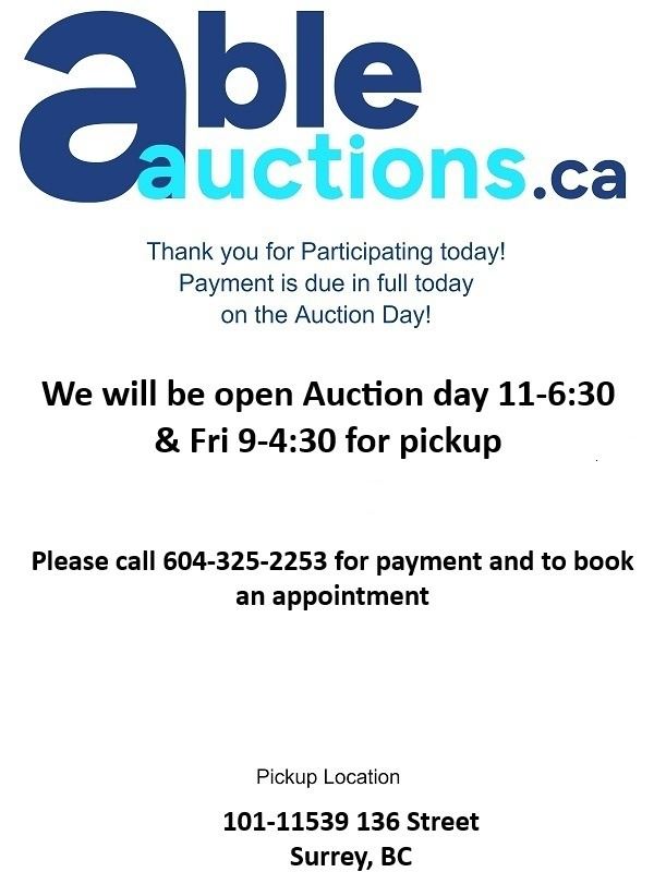 Payment is due in full today. You can authorize us via email or calling 604-325-2253 we can directly charge your Visa or MC on file for any purchases under $999. *Please note we will need to have a verbal confirmation of the last 4 digits of your credit card to process the payment* For e-transfers please email them to payment@ableauctions.ca Payment is online only. Payments for invoices over $999.00 we will need to have an e transfer, wire or direct deposit. Please call to book an appointment for pickup. *Please make sure you are able to make your scheduled pick up time.