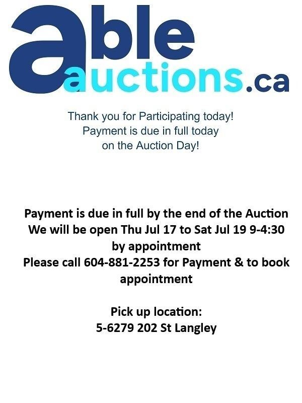 Payment is due in full today. You can authorize us by calling 604-881-2253 we can directly charge your Visa or MC on file for invoices under $999. *Please note we will need to have a verbal confirmation of the last 4 digits of your credit card to process the payment* For invoices over $999 please send e-transfers to payment@ableauctions.ca . We ask you call to book a time slot for pick up.