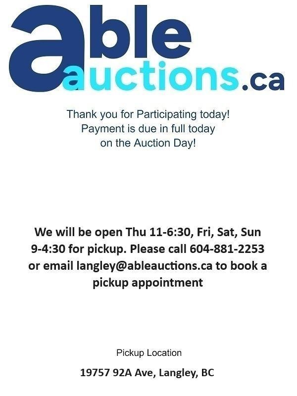 Payment is due in full by noon the day following the auction. You can authorize us by calling 604-881-2253 we can directly charge your Visa or MC on file for invoices under $999. *Please note we will need to have a verbal confirmation of the last 4 digits of your credit card to process the payment* For invoices over $999 please send e-transfers to payment@ableauctions.ca . We ask you call to book a time slot for pick up.