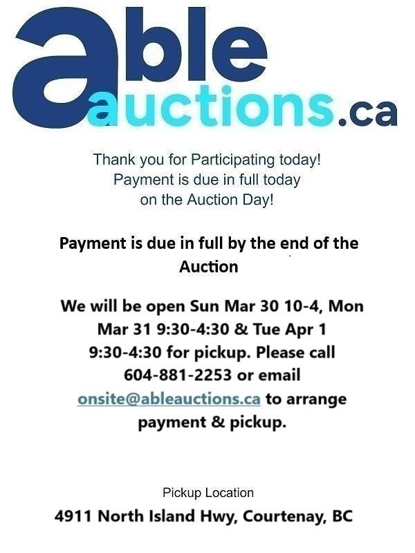 We will be open Thu Mar 27 & Fri Mar 28 9am - 4:30pm for pickup. Please call 604-881-2253 or 1-800-910-1211, or email onsite@ableauctions.ca to arrange payment & pickup.
