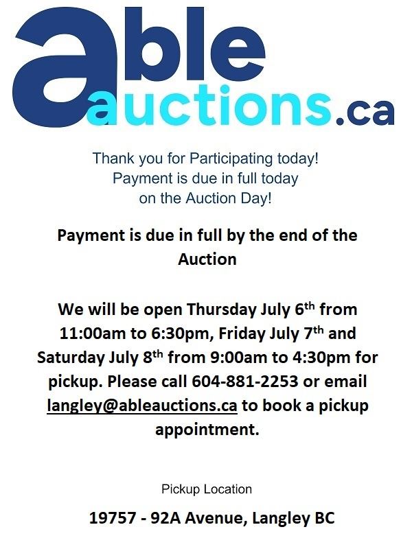 Payment is due in full today. You can authorize us by calling 604-881-2253 we can directly charge your Visa or MC on file for invoices under $999. *Please note we will need to have a verbal confirmation of the last 4 digits of your credit card to process the payment* For invoices over $999 please send e-transfers to payment@ableauctions.ca . We ask you call to book a time slot for pick up.