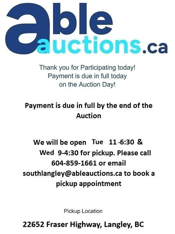 Payment is due in full today. You can authorize us by calling 604-881-2253 we can directly charge your Visa or MC on file for invoices under $999. *Please note we will need to have a verbal confirmation of the last 4 digits of your credit card to process the payment* For invoices over $999 please send e-transfers to payment@ableauctions.ca . We ask you call to book a time slot for pick up.