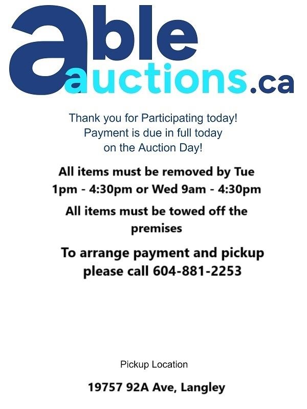 Payment is due in full auction day by 4pm. You can authorize us by calling 604-881-2253 we can directly charge your Visa or MC on file for invoices under $999. We will be in the office Today Tue Sep 10 2024 until 4:30pm & then back Wed Sep 11 2024 9am. *Please note we will need to have a verbal confirmation of the last 4 digits of your credit card to process the payment* For invoices over $999 please send e-transfers to payment@ableauctions.ca . We ask you call to book a time slot for pick up.