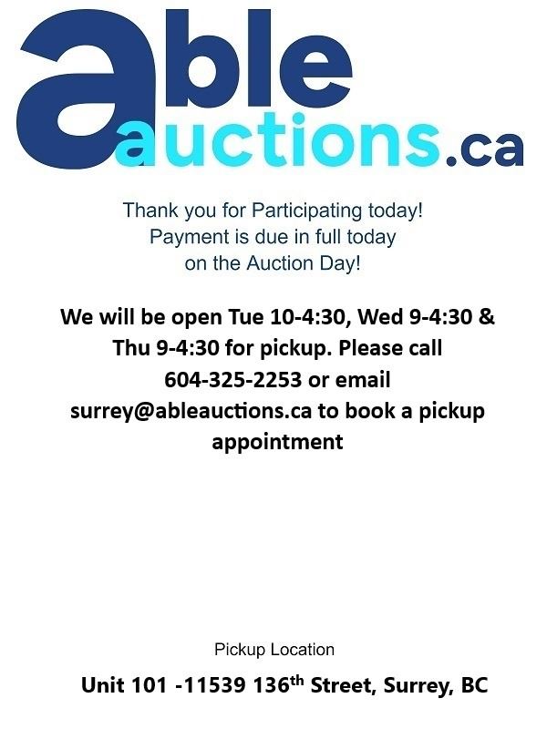 Payment is due in full today. You can authorize us via email or calling 604-325-2253 we can directly charge your Visa or MC on file for any purchases under $999. *Please note we will need to have a verbal confirmation of the last 4 digits of your credit card to process the payment* For e-transfers please email them to payment@ableauctions.ca Payment is online only. Payments for invoices over $999.00 we will need to have an e transfer, wire or direct deposit. Please call to book an appointment for pickup. *Please make sure you are able to make your scheduled pick up time.