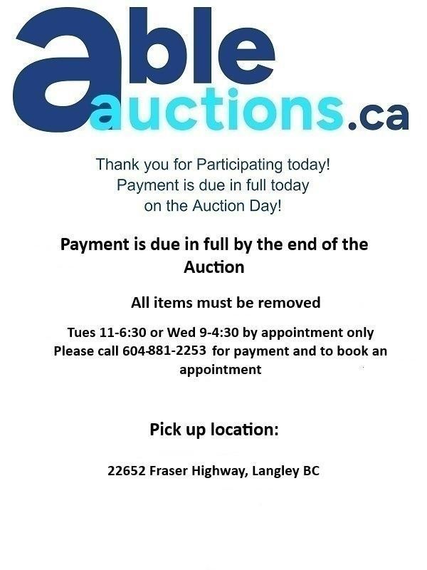 Payment is due in full today. You can authorize us by calling 604-881-2253 we can directly charge your Visa or MC on file for invoices under $999. *Please note we will need to have a verbal confirmation of the last 4 digits of your credit card to process the payment* For invoices over $999 please send e-transfers to payment@ableauctions.ca . We ask you call to book a time slot for pick up.