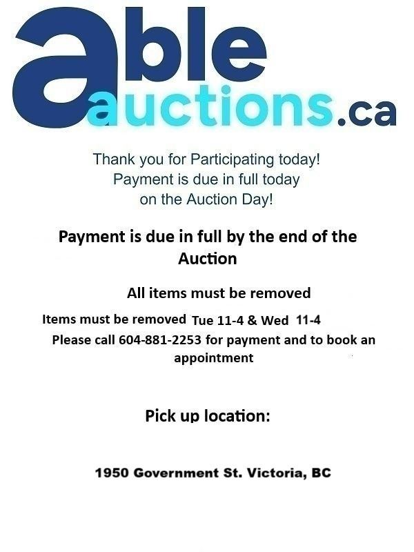 Payment is due in full today. You can authorize us by calling 604-881-2253 we can directly charge your Visa or MC on file for invoices under $999. *Please note we will need to have a verbal confirmation of the last 4 digits of your credit card to process the payment* For invoices over $999 please send e-transfers to payment@ableauctions.ca . We ask you call to book a time slot for pick up.