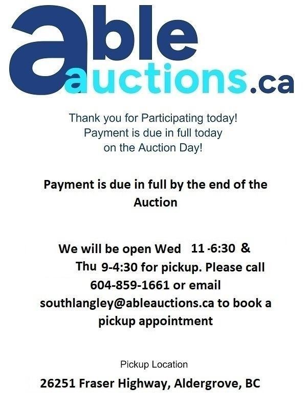 Payment is due in full today. You can authorize us by calling 604-881-2253 we can directly charge your Visa or MC on file for invoices under $999. *Please note we will need to have a verbal confirmation of the last 4 digits of your credit card to process the payment* For invoices over $999 please send e-transfers to payment@ableauctions.ca . We ask you call to book a time slot for pick up.