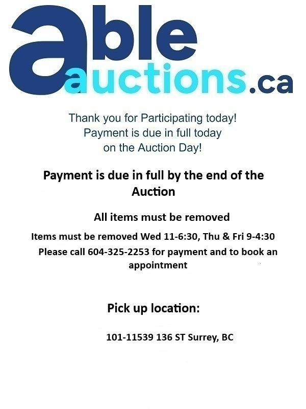 Payment is due in full today. You can authorize us via email or calling 604-325-2253 we can directly charge your Visa or MC on file for any purchases under $999. *Please note we will need to have a verbal confirmation of the last 4 digits of your credit card to process the payment* For e-transfers please email them to payment@ableauctions.ca Payment is online only. Payments for invoices over $999.00 we will need to have an e transfer, wire or direct deposit. Please call to book an appointment for pickup. *Please make sure you are able to make your scheduled pick up time.