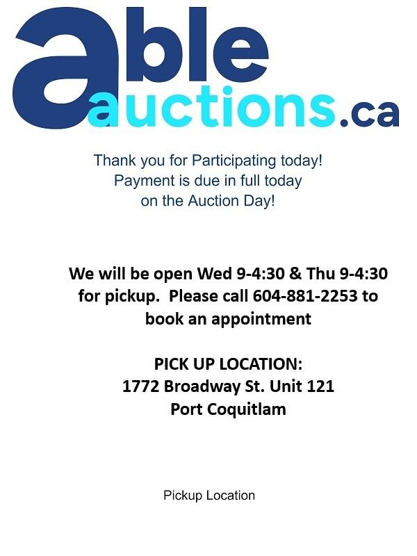 Payment is due in full today. You can authorize us by calling 604-881-2253 we can directly charge your Visa or MC on file for invoices under $999. *Please note we will need to have a verbal confirmation of the last 4 digits of your credit card to process the payment* For invoices over $999 please send e-transfers to payment@ableauctions.ca . We ask you call to book a time slot for pick up.