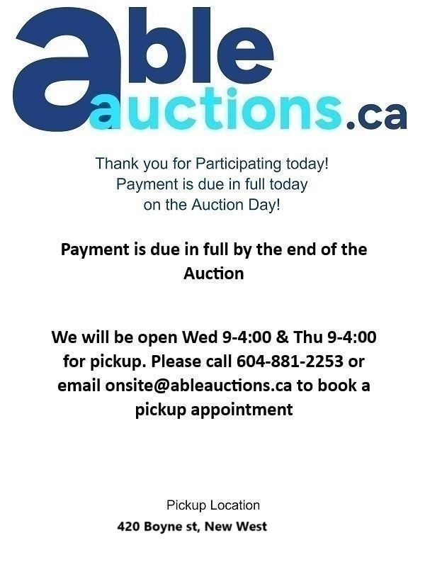 Payment is due in full today. You can authorize us via email or calling 604-881-2253 we can directly charge your Visa or MC on file for any purchases under $999. *Please note we will need to have a verbal confirmation of the last 4 digits of your credit card to process the payment* For e-transfers please email them to payment@ableauctions.ca Payment is online only. Payments for invoices over $999.00 we will need to have an e transfer, wire or direct deposit. Please call to book an appointment for pickup. *Please make sure you are able to make your scheduled pick up time.