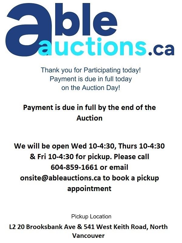 Payment is due in full today. if you authorize us by calling 604-859-1661 we can directly charge your Visa or MC on file (only applies to purchases under $999). *Please note we will need to have a verbal confirmation of the last 4 digits of your credit card to process the payment* For e-transfers please email them to payment@ableauctions.ca Payment is Online only. Pickup is by appointment please call to book a time slot.