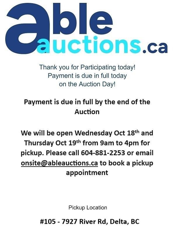 Payment is due in full today. if you authorize us by calling 604-881-2253 we can directly charge your Visa or MC on file (only applies to purchases under $999). *Please note we will need to have a verbal confirmation of the last 4 digits of your credit card to process the payment* For e-transfers please email them to payment@ableauctions.ca Payment is Online only. Pickup is by appointment please call to book a time slot.