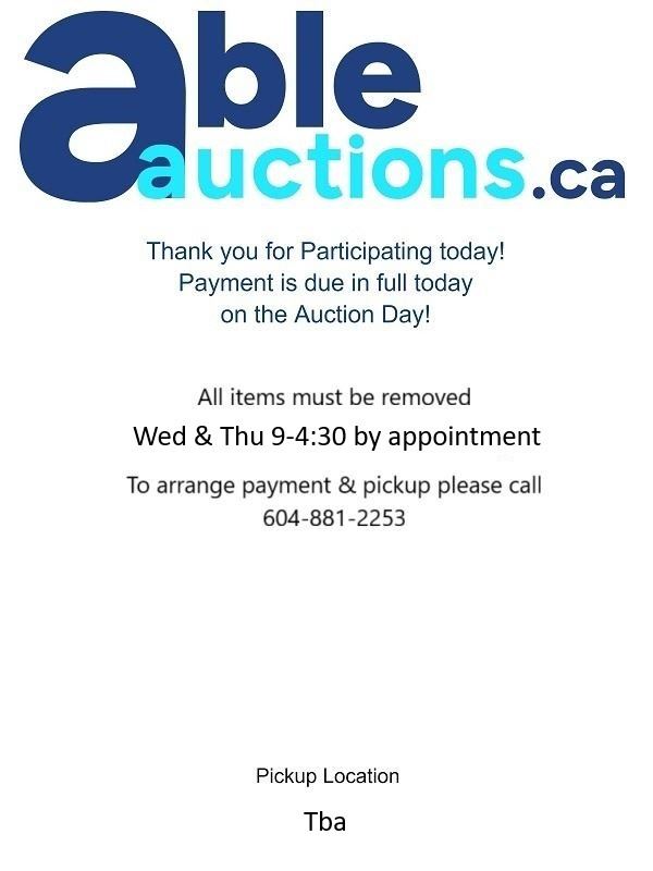 Payment is due in full today. You can authorize us by calling 604-881-2253 we can directly charge your Visa or MC on file for invoices under $999. *Please note we will need to have a verbal confirmation of the last 4 digits of your credit card to process the payment* For invoices over $999 please send e-transfers to payment@ableauctions.ca . We ask you call to book a time slot for pick up.