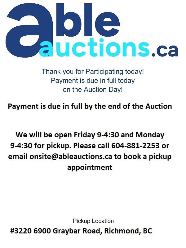 Payment is due in full today. if you authorize us by calling 604-881-2253 we can directly charge your Visa or MC on file (only applies to purchases under $999). *Please note we will need to have a verbal confirmation of the last 4 digits of your credit card to process the payment* For e-transfers please email them to payment@ableauctions.ca Payment is Online only. Pickup is by appointment please call to book a time slot.