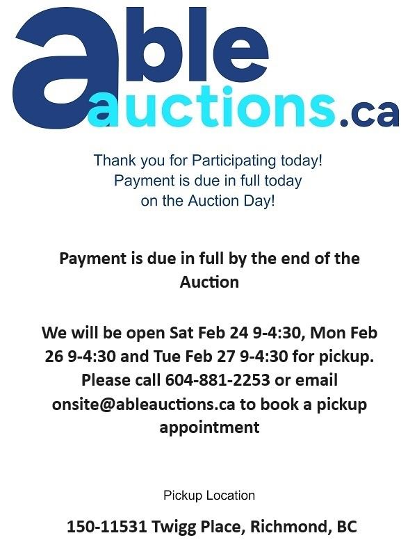 Payment is due in full today. if you authorize us by calling 604-881-2253 we can directly charge your Visa or MC on file (only applies to purchases under $999). *Please note we will need to have a verbal confirmation of the last 4 digits of your credit card to process the payment* For e-transfers please email them to payment@ableauctions.ca Payment is Online only. Pickup is by appointment please call to book a time slot.