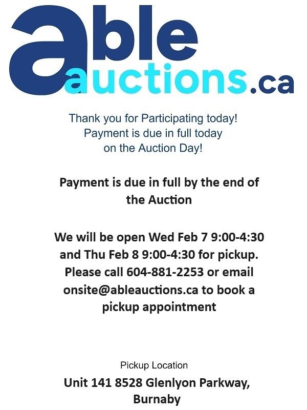 Payment is due in full today. if you authorize us by calling 604-881-2253 we can directly charge your Visa or MC on file (only applies to purchases under $999). *Please note we will need to have a verbal confirmation of the last 4 digits of your credit card to process the payment* For e-transfers please email them to payment@ableauctions.ca Payment is Online only. Pickup is by appointment please call to book a time slot.