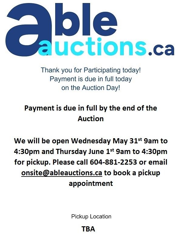 Payment is due in full today. if you authorize us by calling 604-881-2253 we can directly charge your Visa or MC on file (only applies to purchases under $999). *Please note we will need to have a verbal confirmation of the last 4 digits of your credit card to process the payment* For e-transfers please email them to payment@ableauctions.ca Payment is Online only. Pickup is by appointment please call to book a time slot.