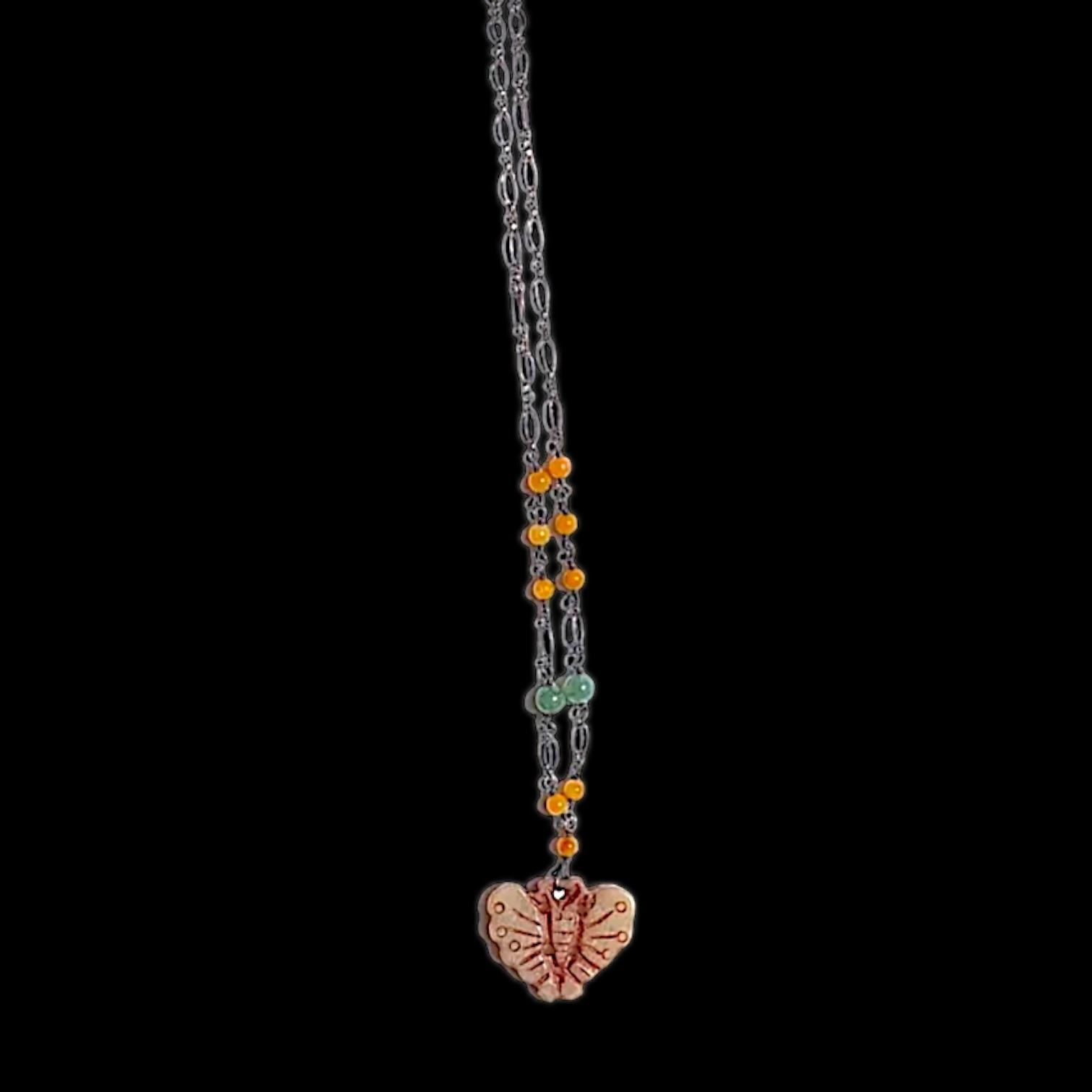 Antique Natural Red Carved Jade Butterfly Pendant Beaded Chain Necklace