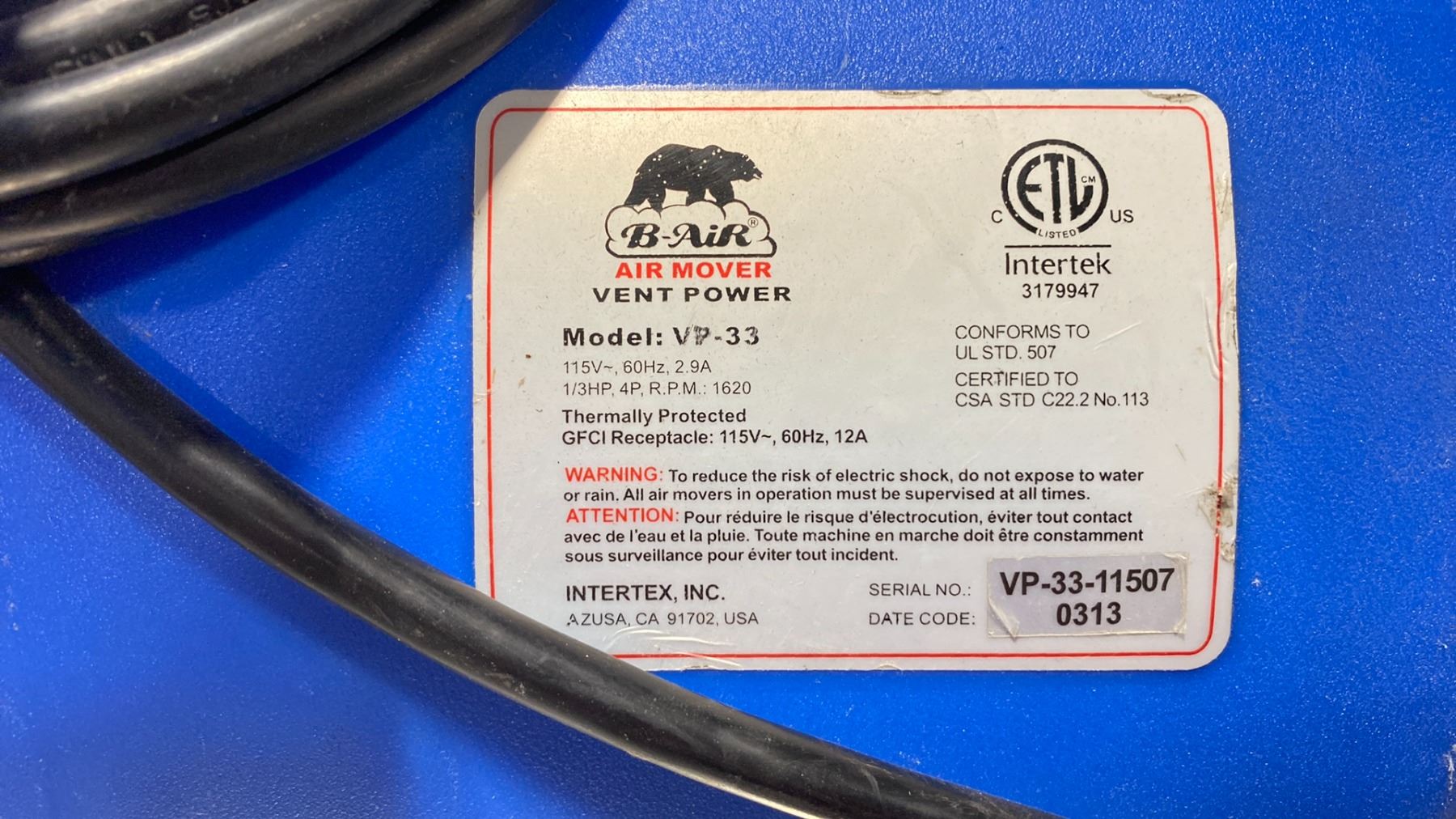 B-AIR VP-33 VENT POWER COMMERCIAL ELECTRIC CENTRIFUGAL RESTORATION AIR MOVER *COLOR BLUE*