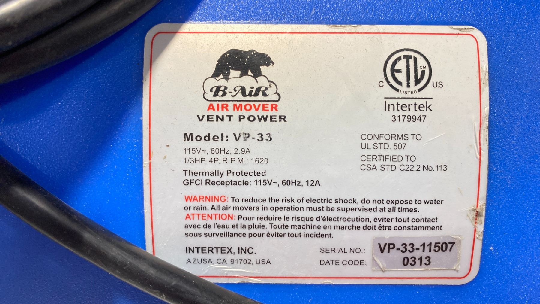 B-AIR VP-33 VENT POWER COMMERCIAL ELECTRIC CENTRIFUGAL RESTORATION AIR MOVER *COLOR BLUE*