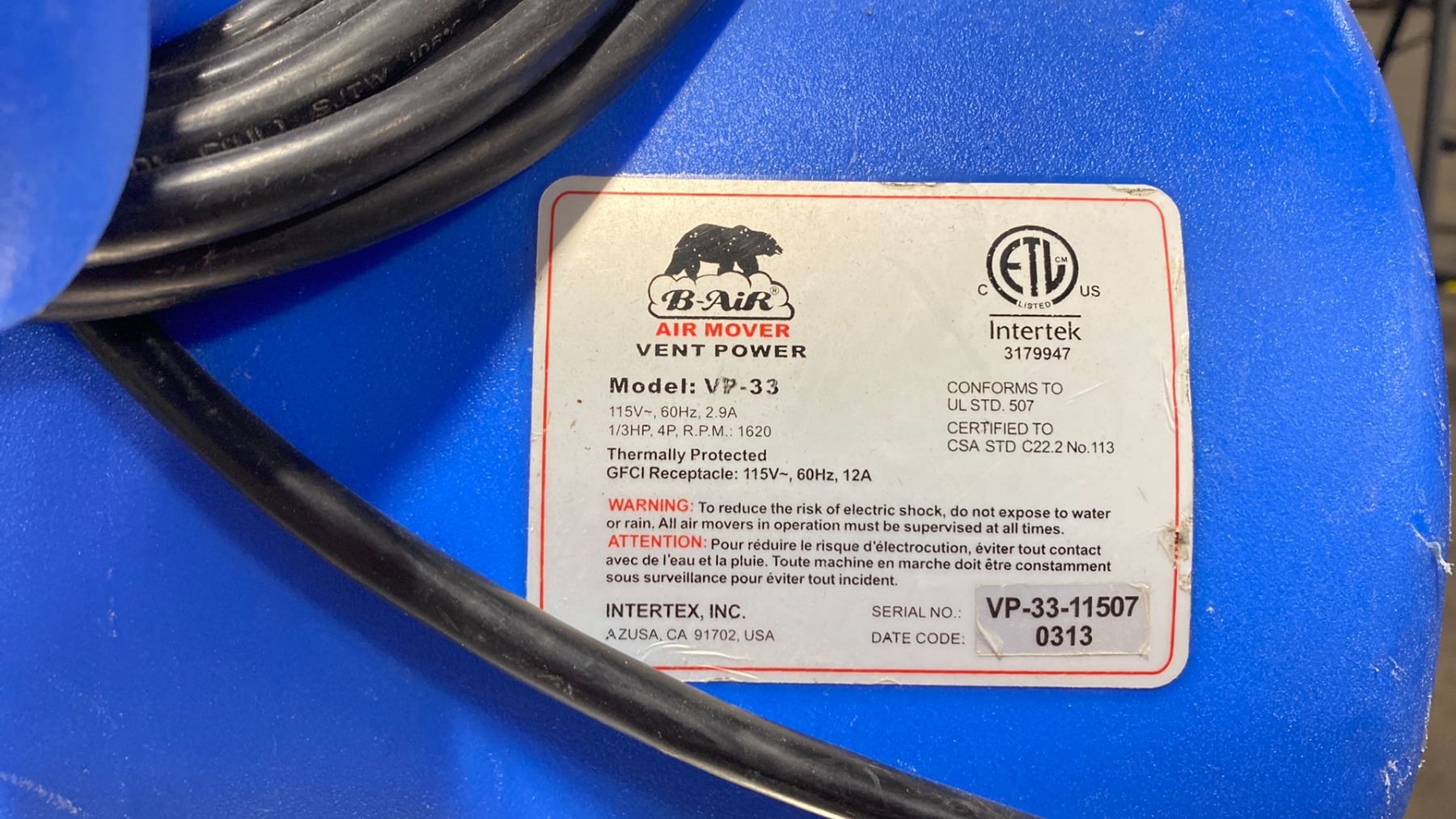 B-AIR VP-33 VENT POWER COMMERCIAL ELECTRIC CENTRIFUGAL RESTORATION AIR MOVER *COLOR BLUE*