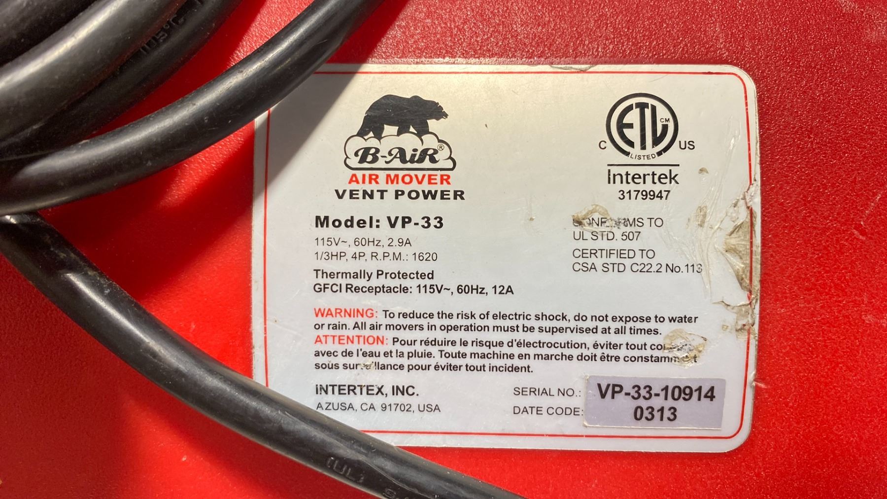 B-AIR VP-33 VENT POWER COMMERCIAL ELECTRIC CENTRIFUGAL RESTORATION AIR MOVER *COLOR RED*
